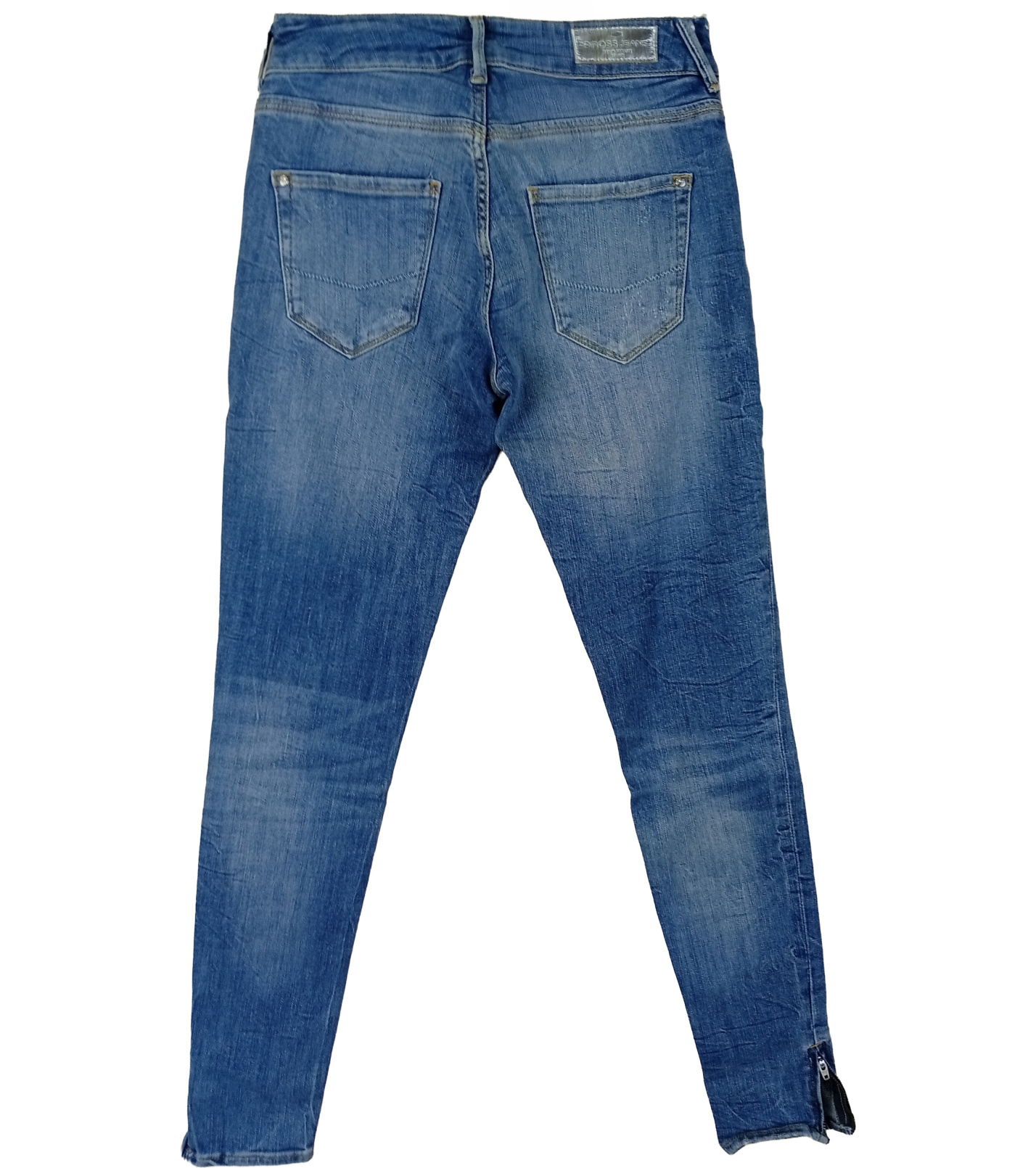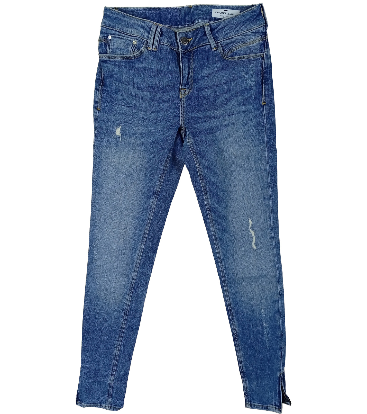 Dámske džínsy Cross Jeans v modernom svetlo modrom denime s ľahkým „used“ efektom a decentnými odreninami. Strih s úzkymi nohavicami a stredne vysokým pásom krásne zvýrazní postavu, spodná časť nohavíc je oživená malým rázporkom. Klasické zapínanie na zips a gombík dopĺňa päť praktických vreciek. Vďaka pružnému materiálu sú džínsy pohodlné na nosenie a skvele sa hodia k ležérnym aj trendy outfitom.