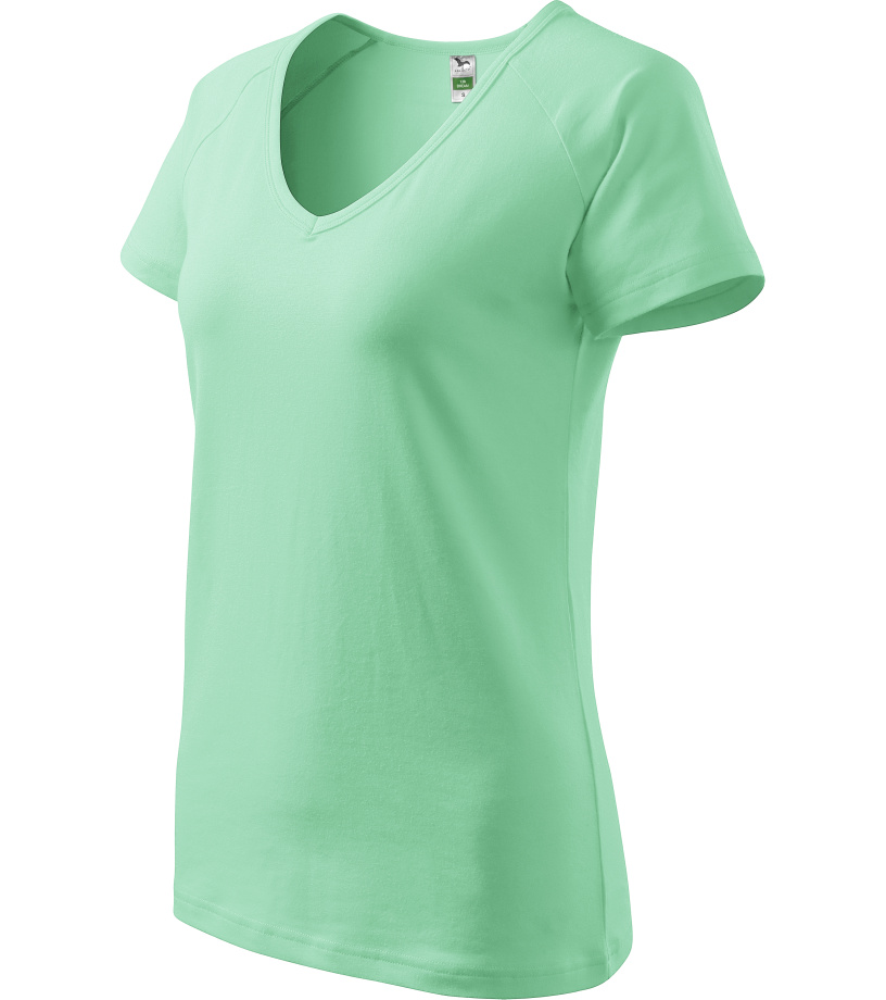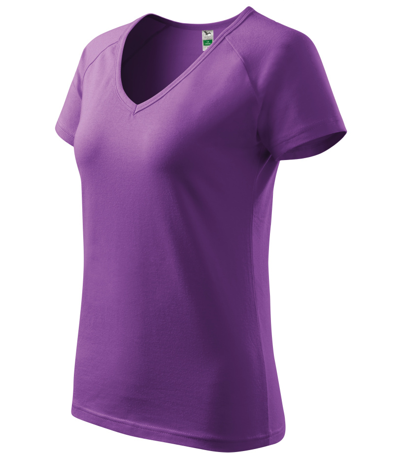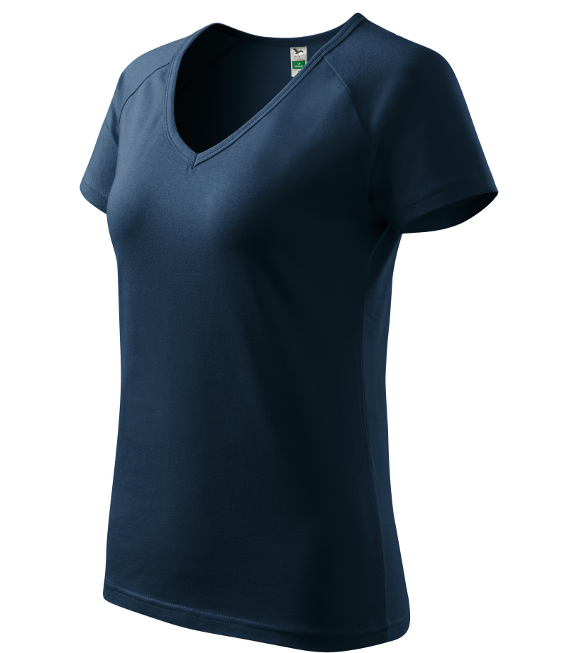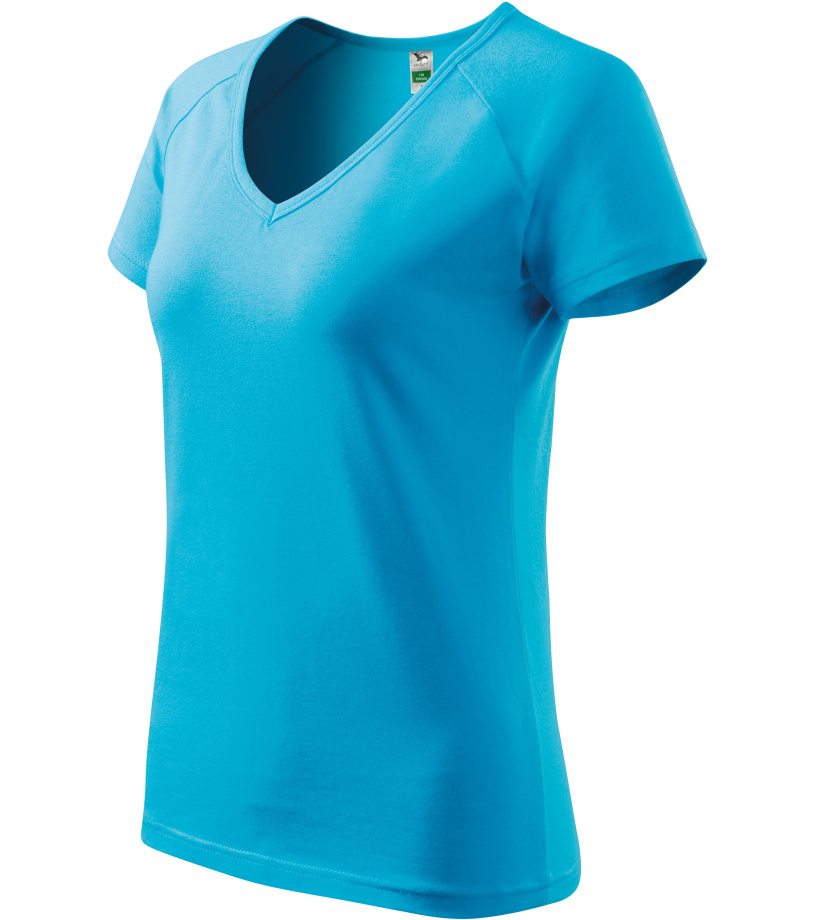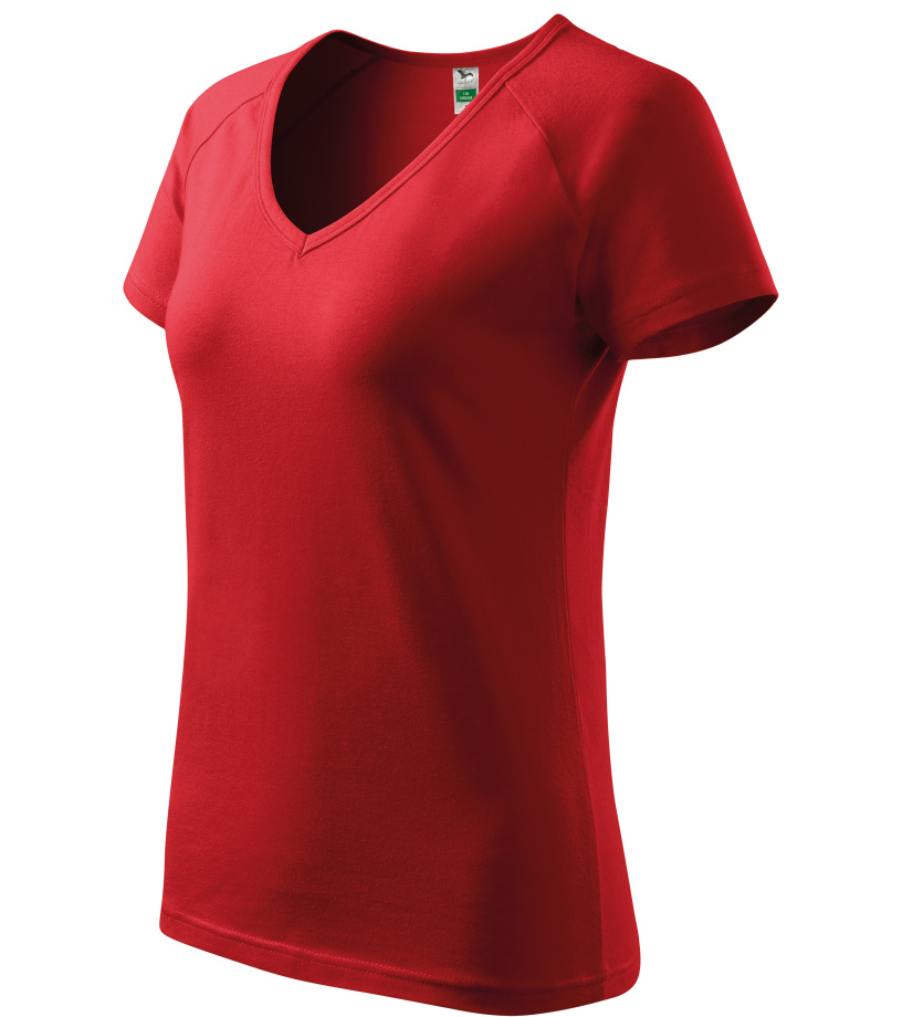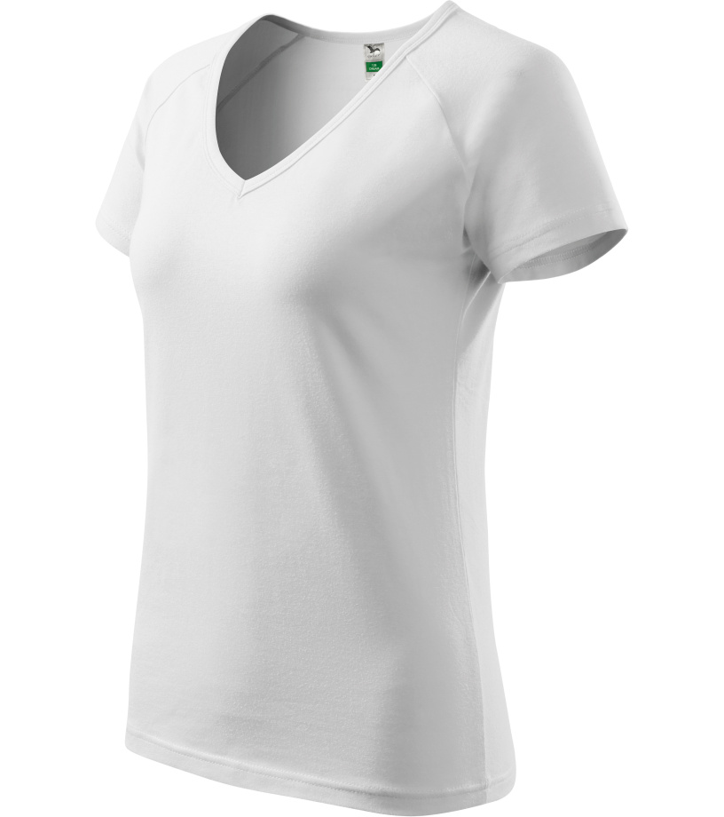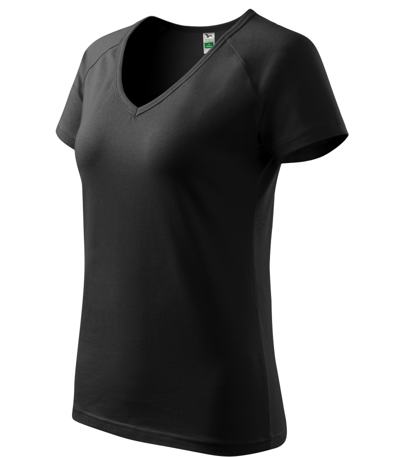 Kvalitné dámske tričko s priliehavým strihom s bočnými švami, výstrihom do V a krátkymi raglánovými rukávmi vyrobené zo strečového materiálu, ktorý si zachováva tvarovú stálosť vhodné na potlač a výšivky má výstrih podšitý vrchným materiálom