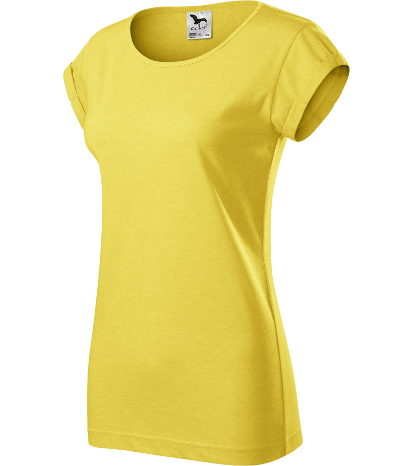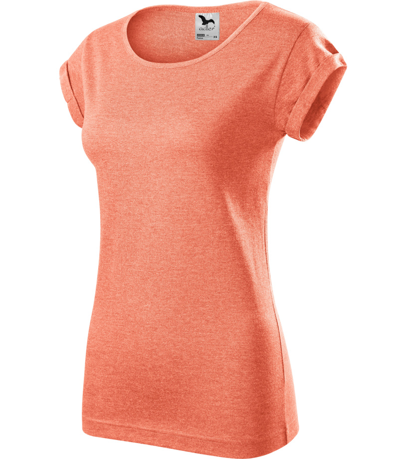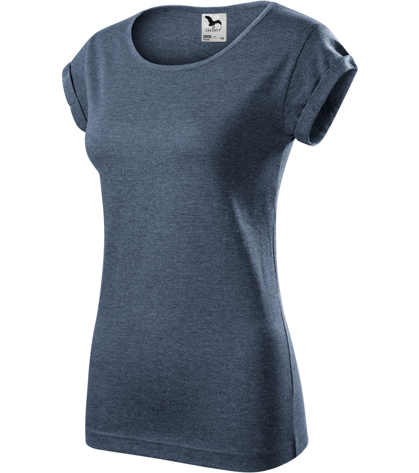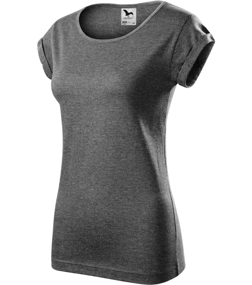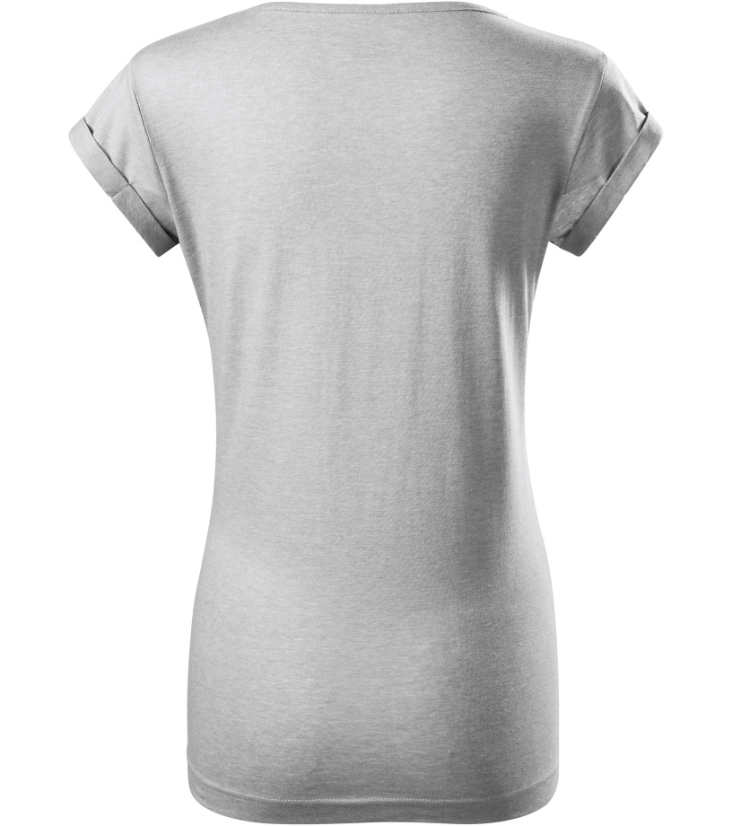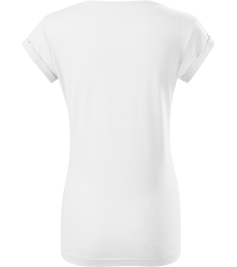 Dámske tričko voľného strihu s bočnými švami vhodné na sublimačnú potlač (svetlé farby) má ohrnuté rukávy zachytené na 4 miestach prešitím, výstrih podšitý vrchným materiálom a ramenné švy spevnené páskou.
