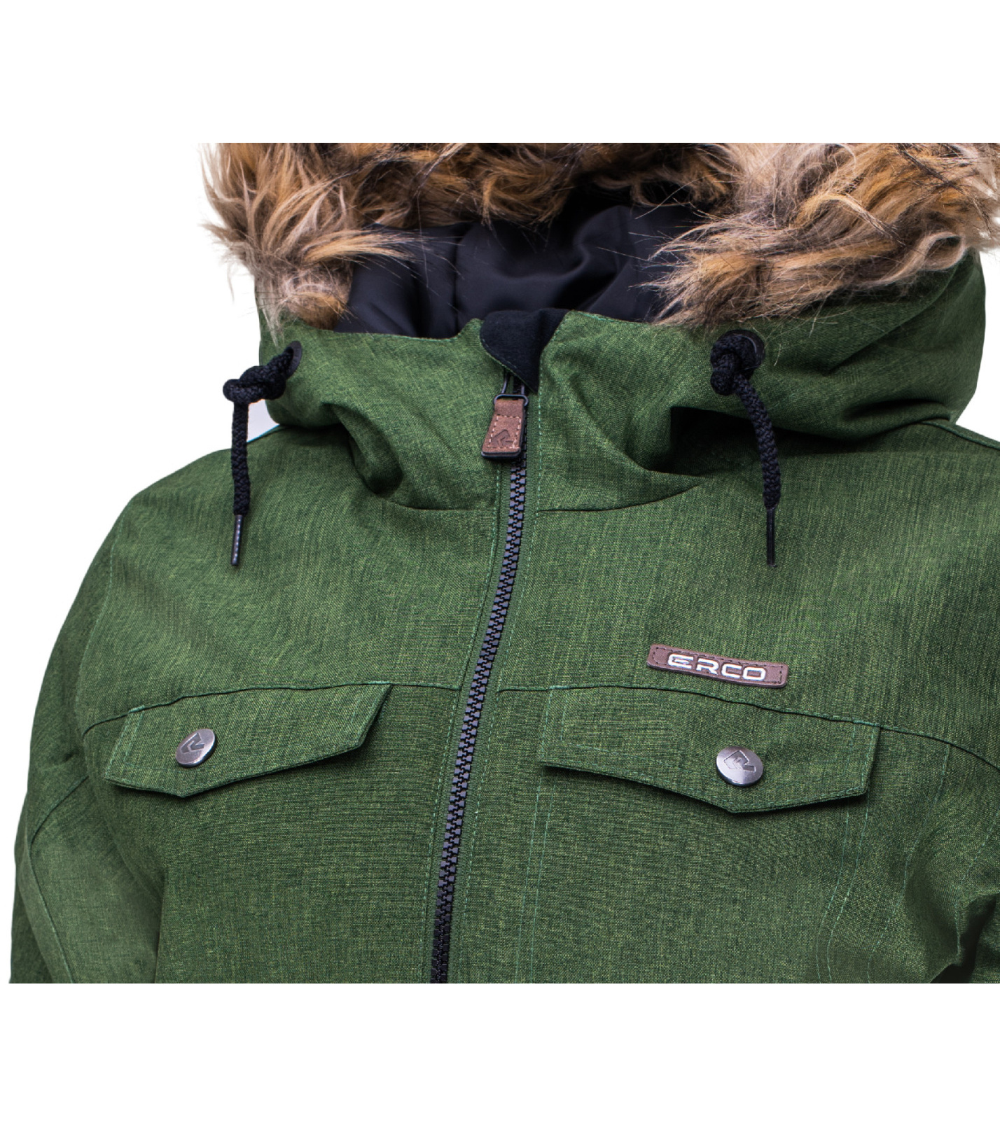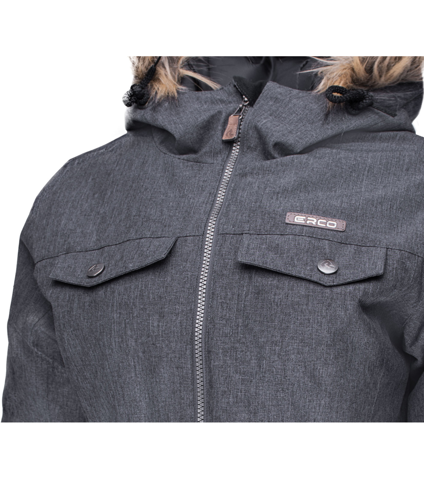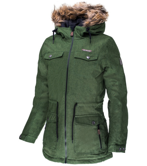 Zimná bunda Erco Daronia je vyrobená z kvalitného vodoodpudivého úpletu Performance Oxford 5 000. O hrejivosť sa pre zmenu postará kvalitná výplň z dutých vlákien. Bundu ďalej zdobí umelý kožúšok, ktorý je možné v prípade potreby odopnúť. Samotná kapucňa je integrovaná s možnosťou nastavenia previsu na suchý zips. Bundu je možné stiahnuť v páse a aj na rukávoch vďaka manžetám.