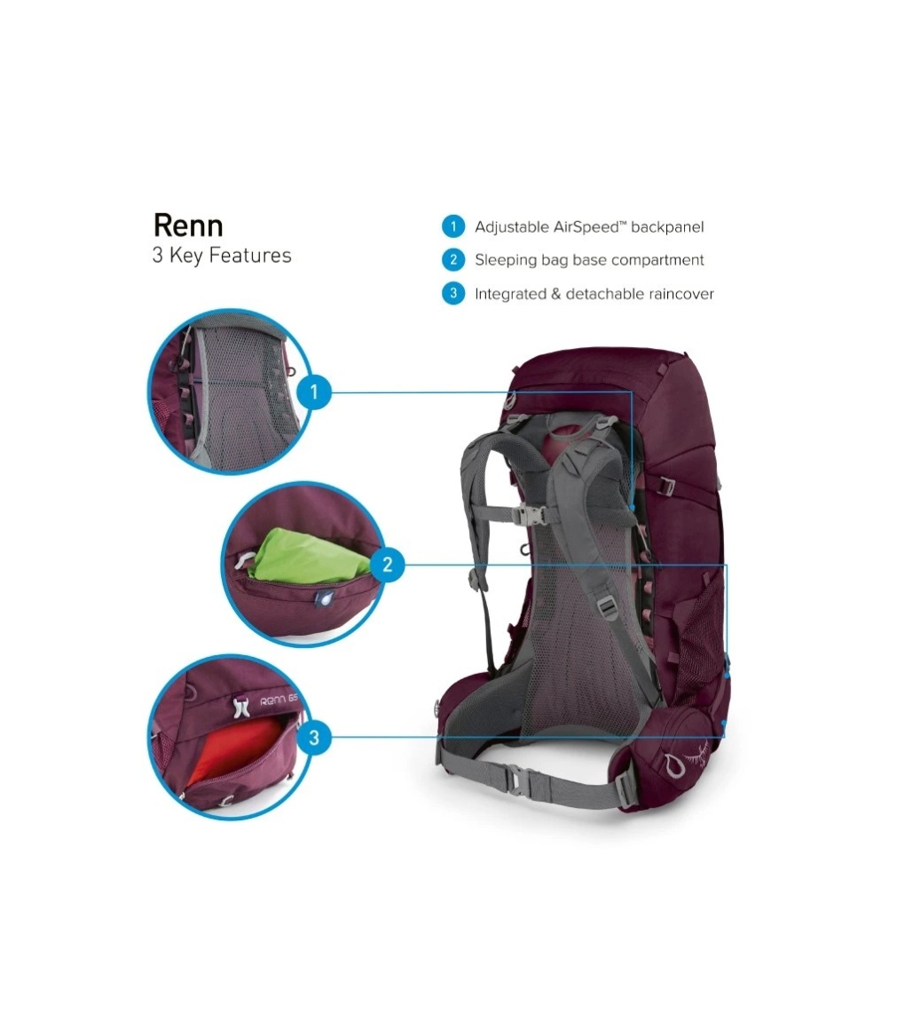 Stvorený pre dobrodružstvo! Inovatívny dámsky batoh Renn 50, vďaka jednoduchému a modernému dizajnu, poskytuje maximálne pohodlie a skvele sedí na chrbte. Je jednoducho nastaviteľný, so špeciálnym vetrajúcim chrbtovým systémom a ukrýva v sebe pláštenku. Batoh Renn 50 je tiež kompatibilný s batohmi Osprey Daylite, takže môžete menší batoh pripevniť na Renn a tým znateľne zvýšiť jeho kapacitu. To sa tiež hodí pri menších výletoch, kedy ho môžete nechať v táborisku a vziať len malý batôžtek. Renn sa jednoducho postaví každej výzve!