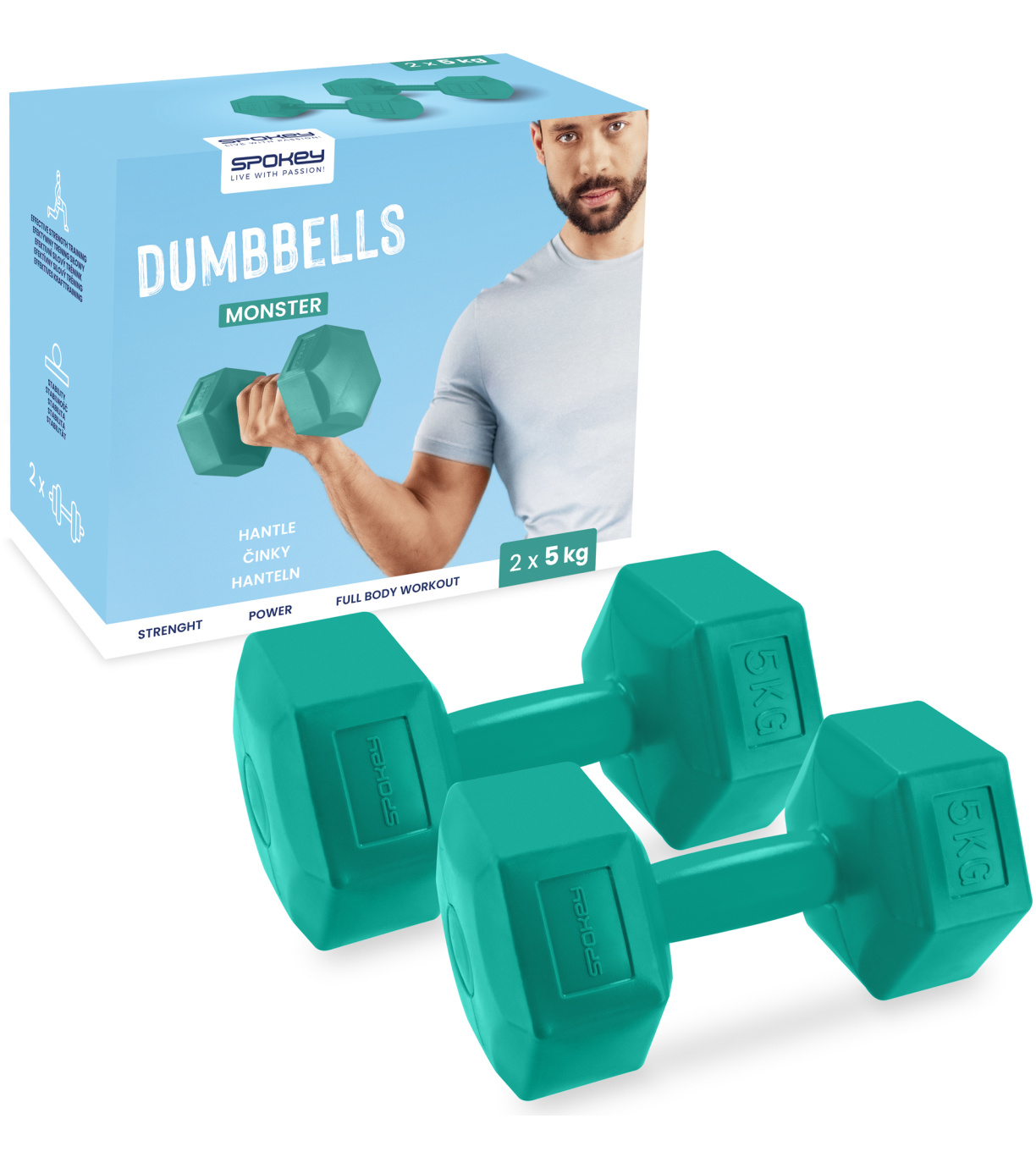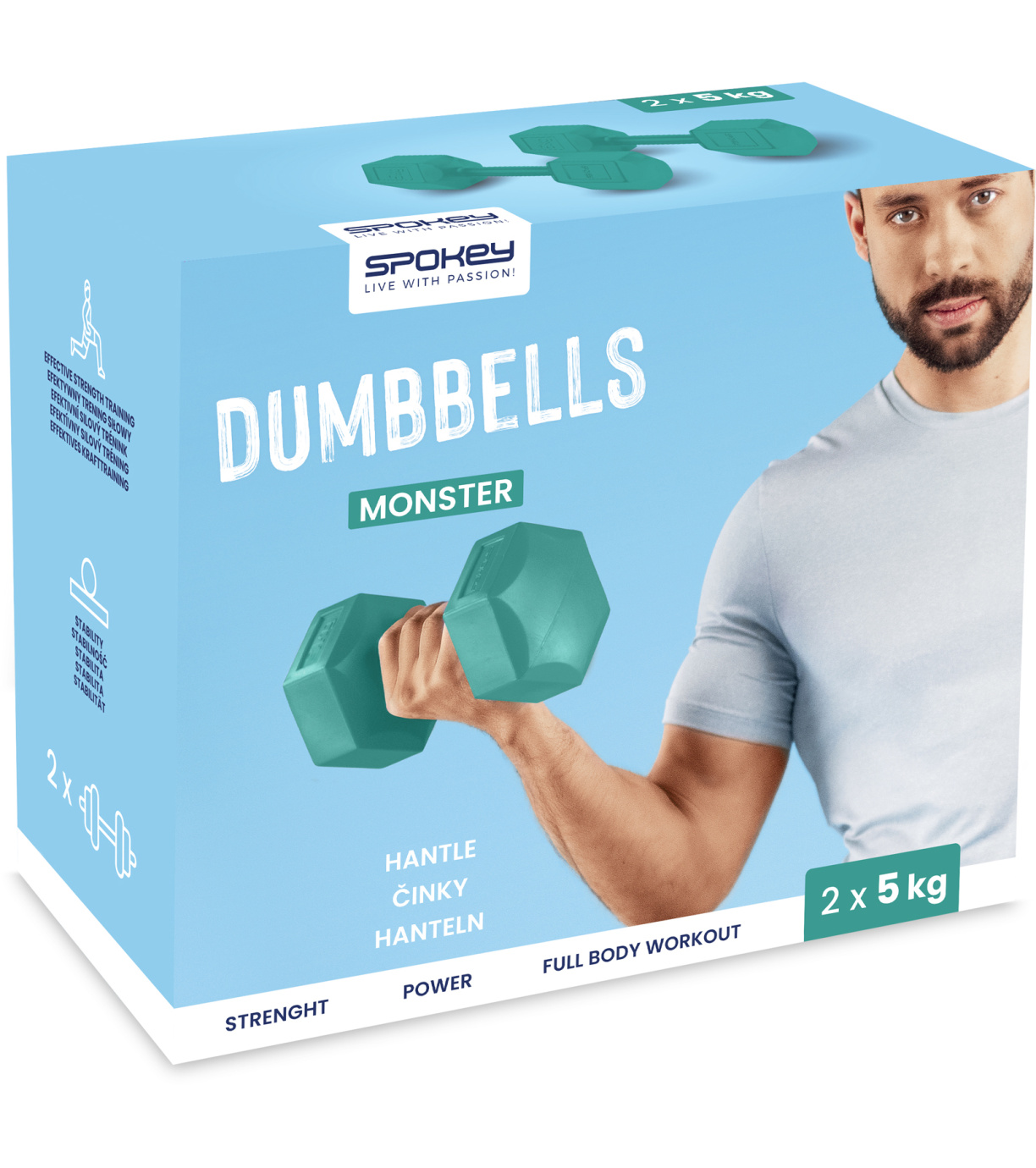 MONSTER sú navrhnuté tak, aby jej tvar umožňoval pohodlné umiestnenie dlane a následný pevný úchop. Šesťhranný tvar činiek Spokey MONSTER zaisťuje stabilitu počas rôznych cvikov (napr. kľučky s využitím činiek), a zároveň zabraňuje voľnému pohybu činiek po podlahe. Sada činiek MONSTER, to sú dve činky s rovnakou hmotnosťou , vďaka čomu môžete cvičiť rovnomerne tak, že budete mať jednu činku v každej ruke, alebo držať obe činky v jednej ruke a zvýšiť tým intenzitu vášho cvičenia.