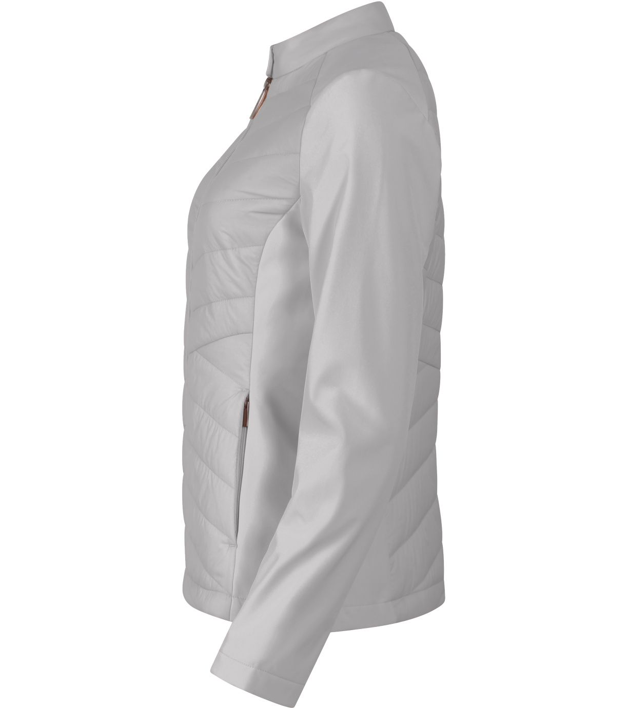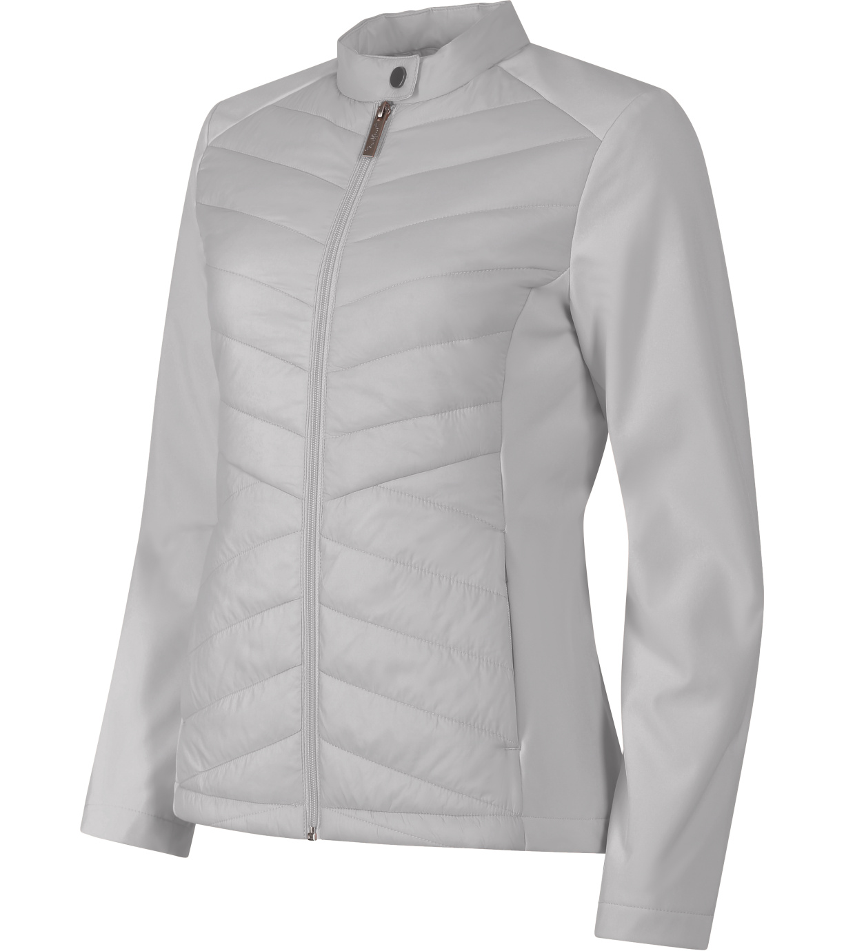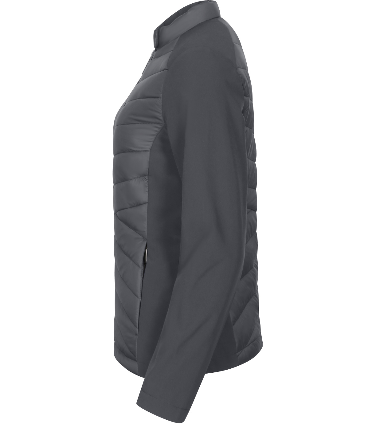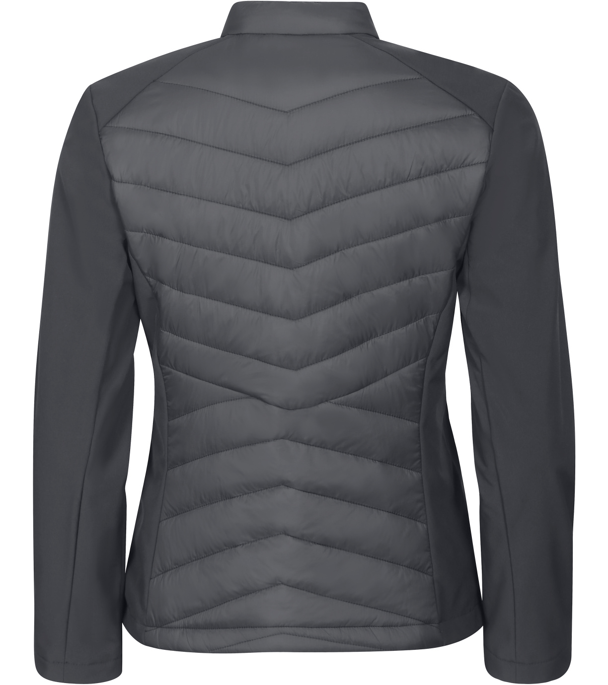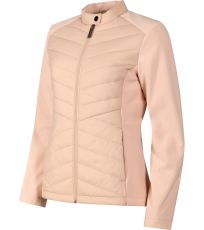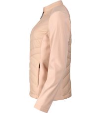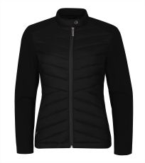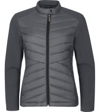 Dámska hybridná bunda, kombinácia prešívaného a softshellového materiálu, strih tvarovaný bočnými dielmi, stojačik na cvok, celoprepínací špirálový zips, bočné vrecká so špirálovým zipsom, vnútorné náprsné vrecko na zips, vstup pre branding v podšívke zadného dielu.