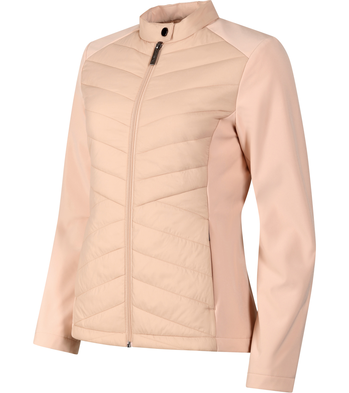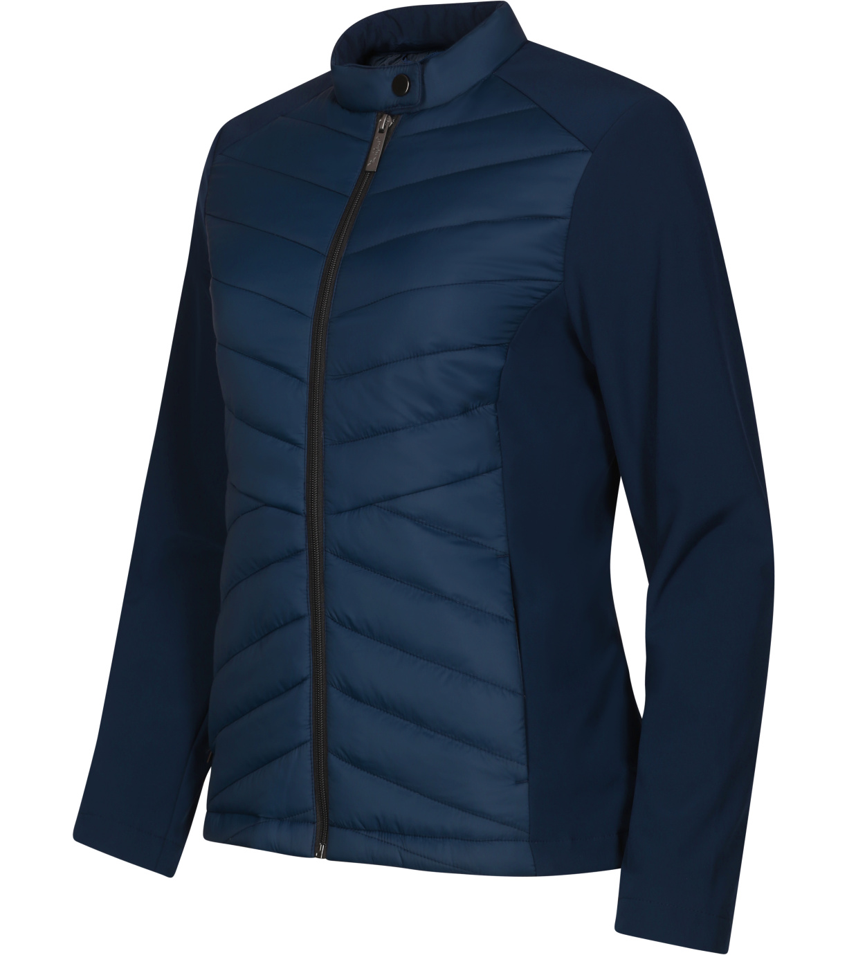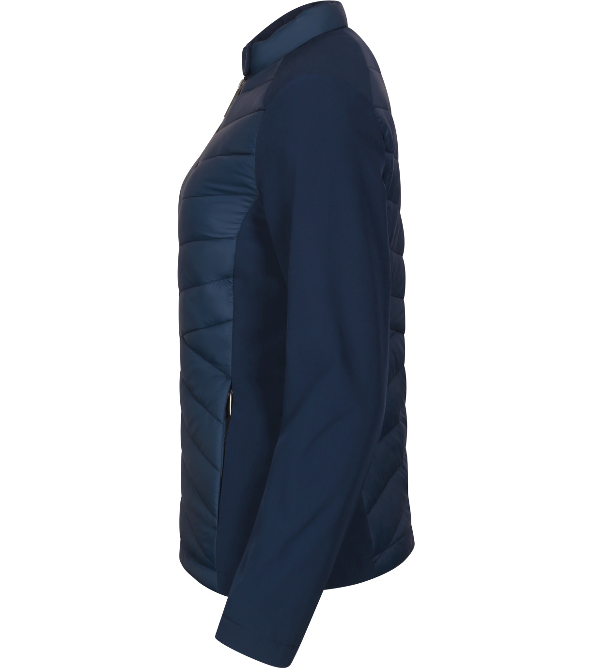 Dámska hybridná bunda, kombinácia prešívaného a softshellového materiálu, strih tvarovaný bočnými dielmi, stojačik na cvok, celoprepínací špirálový zips, bočné vrecká so špirálovým zipsom, vnútorné náprsné vrecko na zips, vstup pre branding v podšívke zadného dielu.