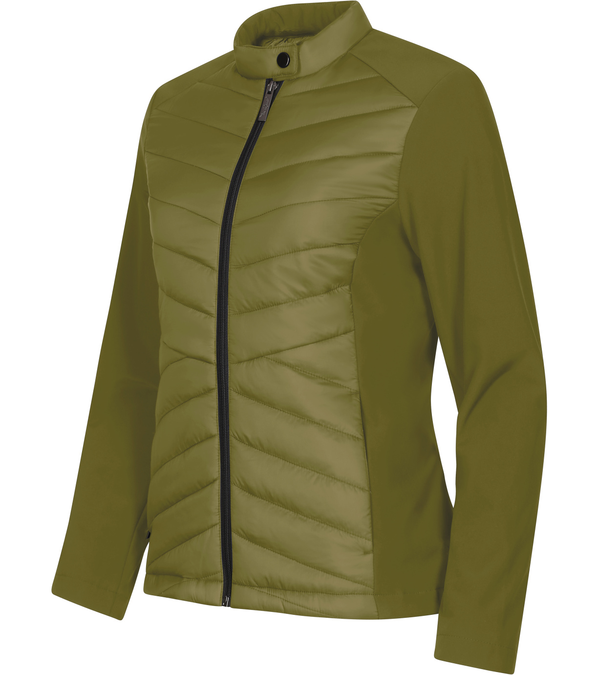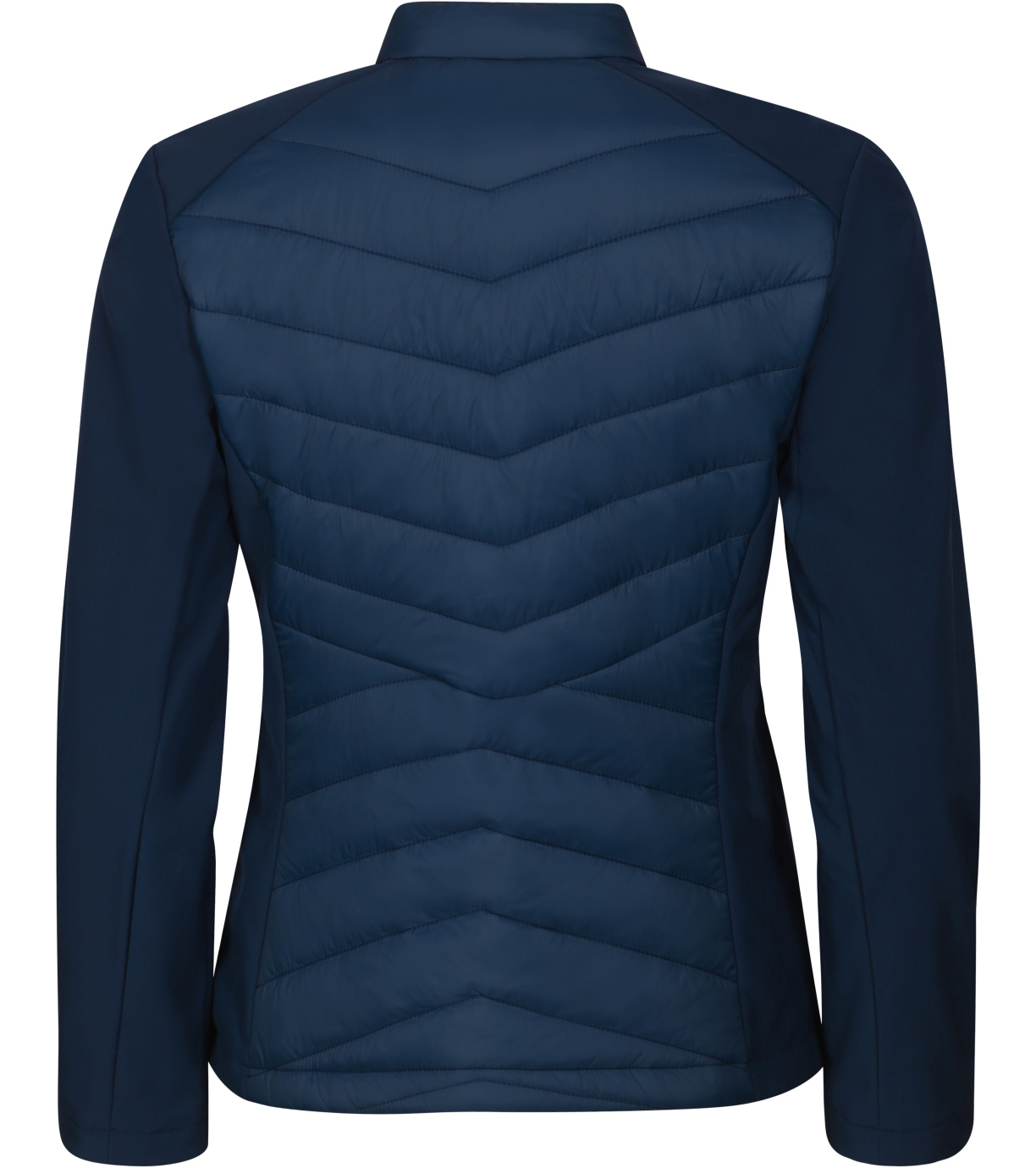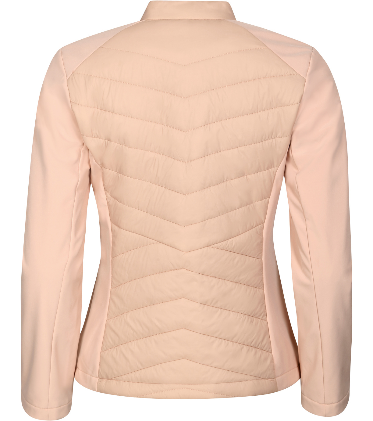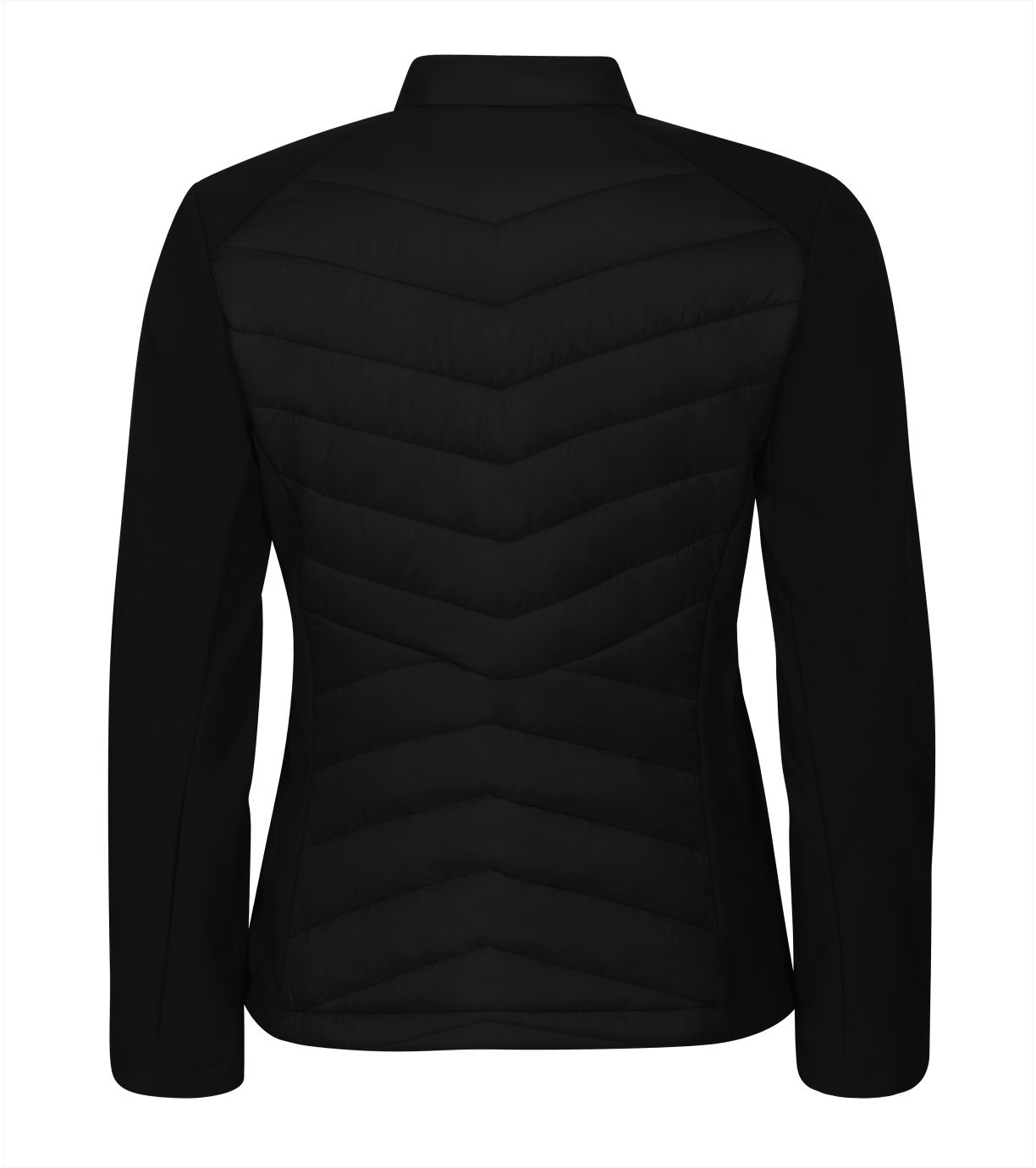 Dámska hybridná bunda, kombinácia prešívaného a softshellového materiálu, strih tvarovaný bočnými dielmi, stojačik na cvok, celoprepínací špirálový zips, bočné vrecká so špirálovým zipsom, vnútorné náprsné vrecko na zips, vstup pre branding v podšívke zadného dielu.