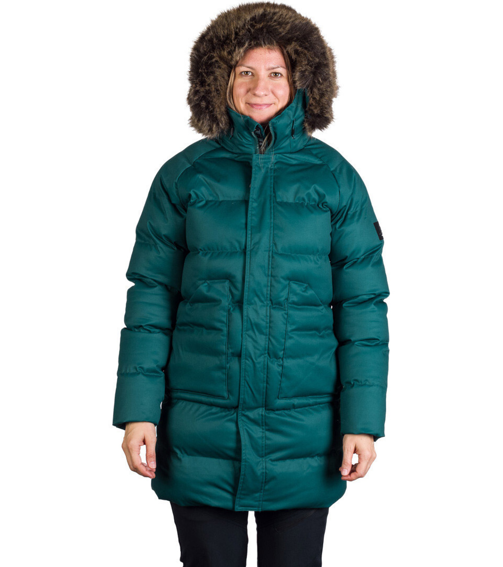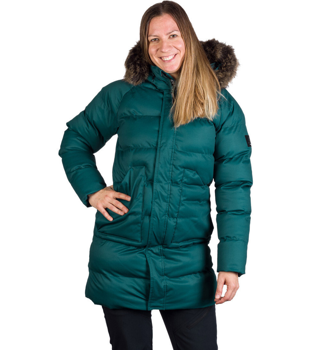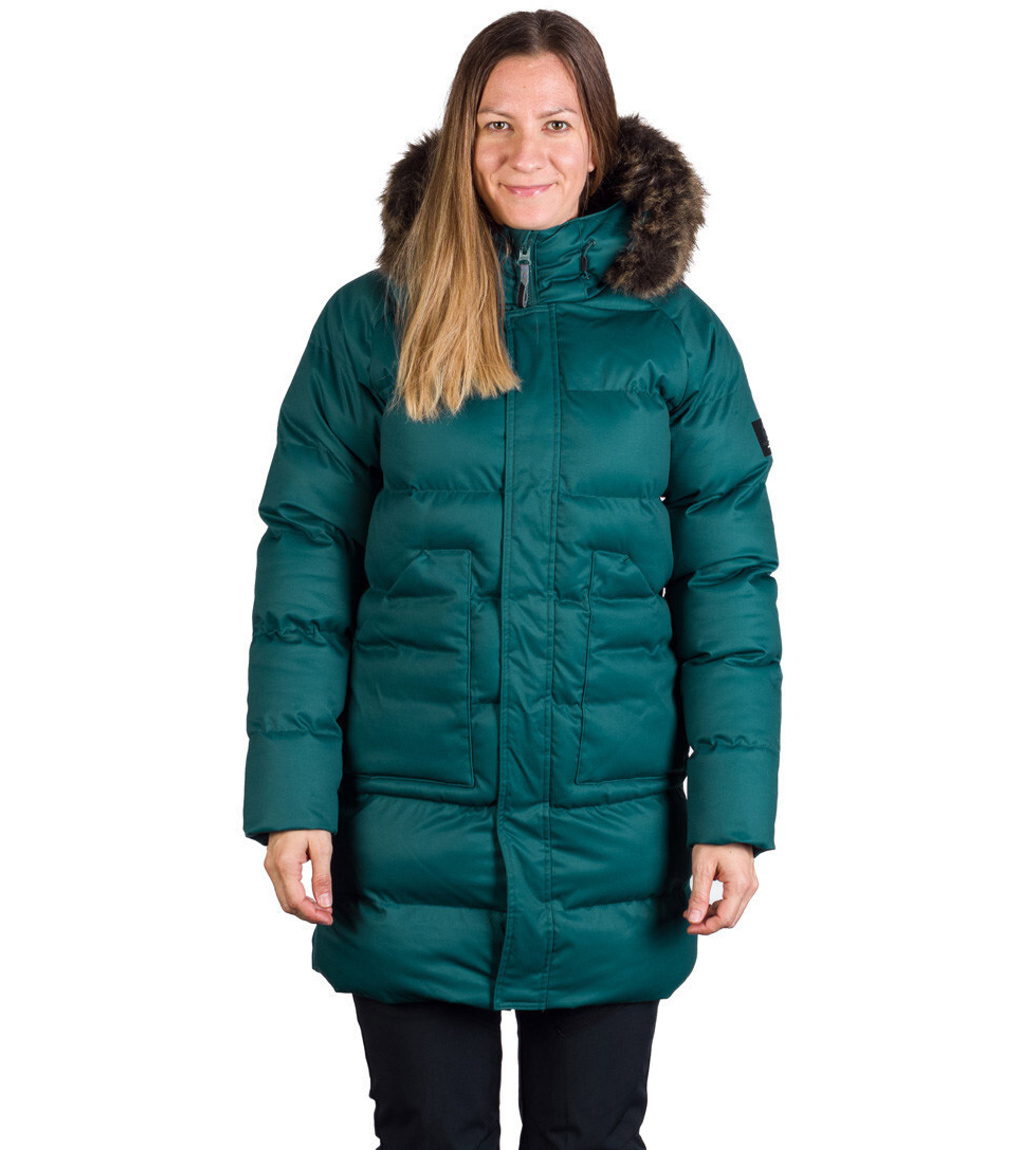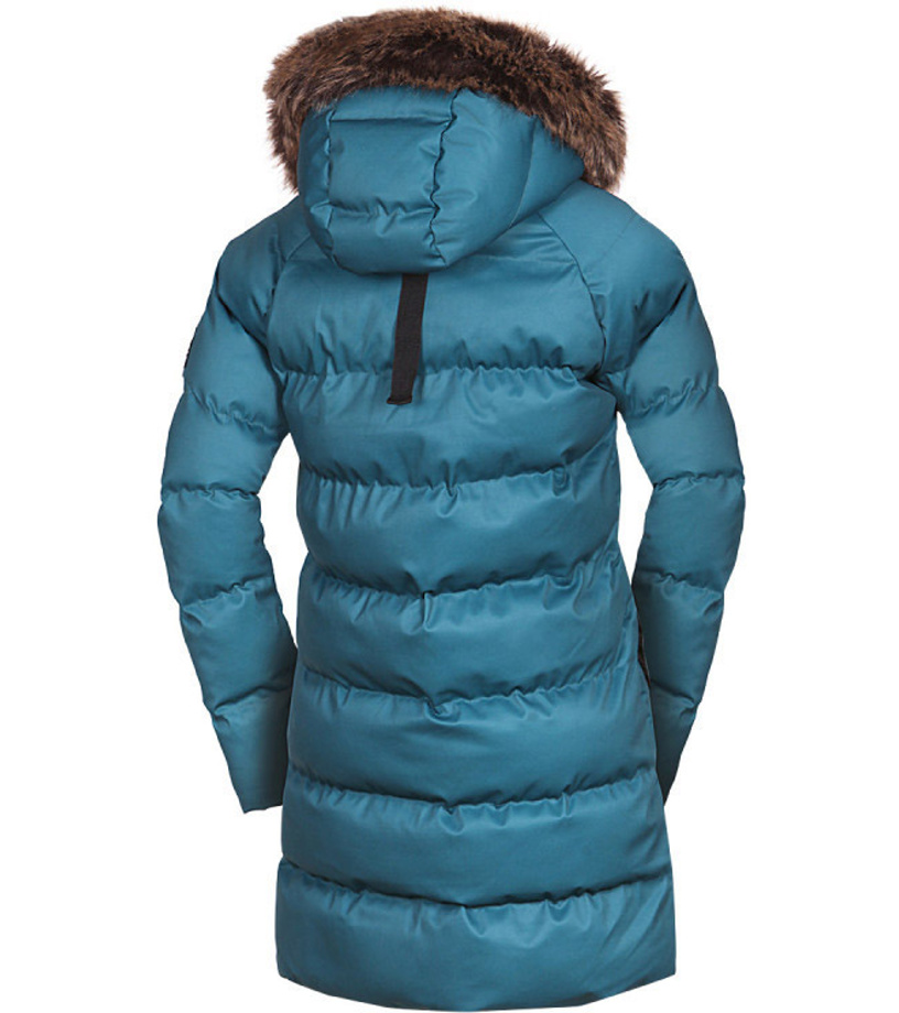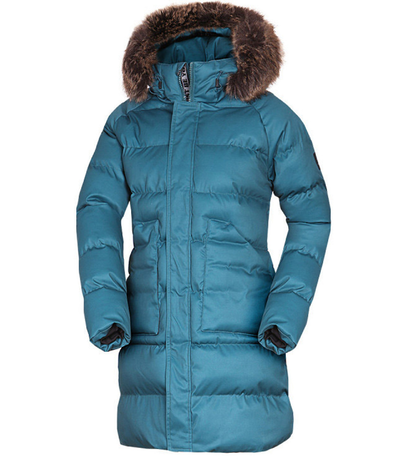 Dámska zimná bunda vhodná do mesta aj na hory. Má pevnejší materiál s keprovou väzbou a vodeodolnou úpravou. Bunda je veľmi teplá, ochráni tak aj vo väčších mrazoch. Kožušina na golieri je syntetická a ľahko odpínateľná. Strihovo je bunda ľahko vytvarovaná okolo pása s jemne predĺženou dĺžkou pod bokmi. Dve veľké vrecká na prednom diele sú zaujímavým ozdobným prvkom, na vnútornej strane bundy je navyše malé vrecko na zips na drobnosti. Na vnútornej strane rukávov nájdete elastické manžety, ktoré pekne priľnú k zápästiu a zabránia tak prefúknutiu.