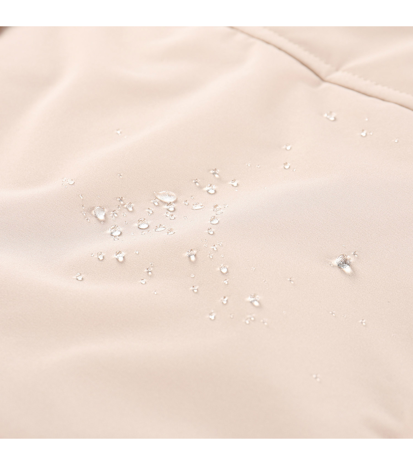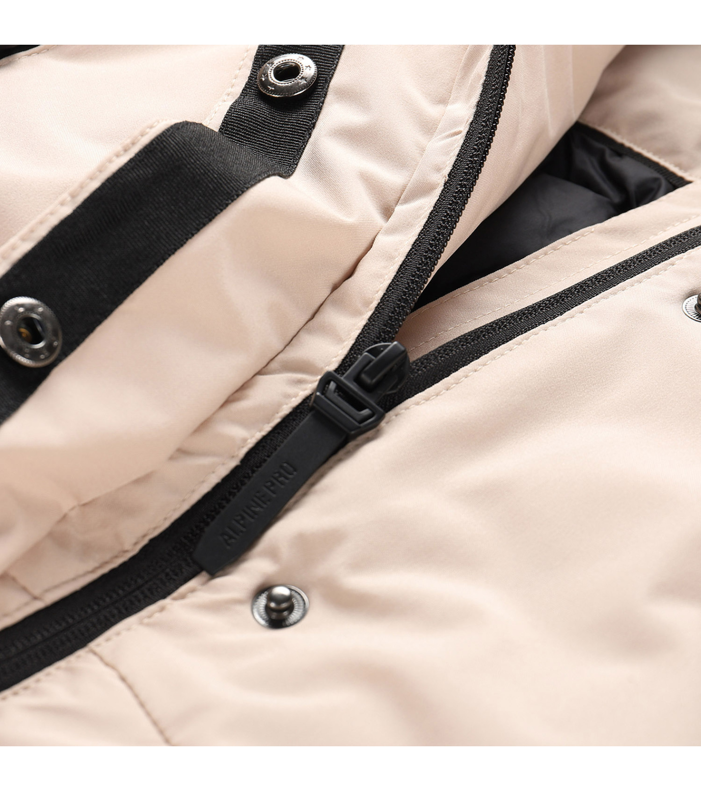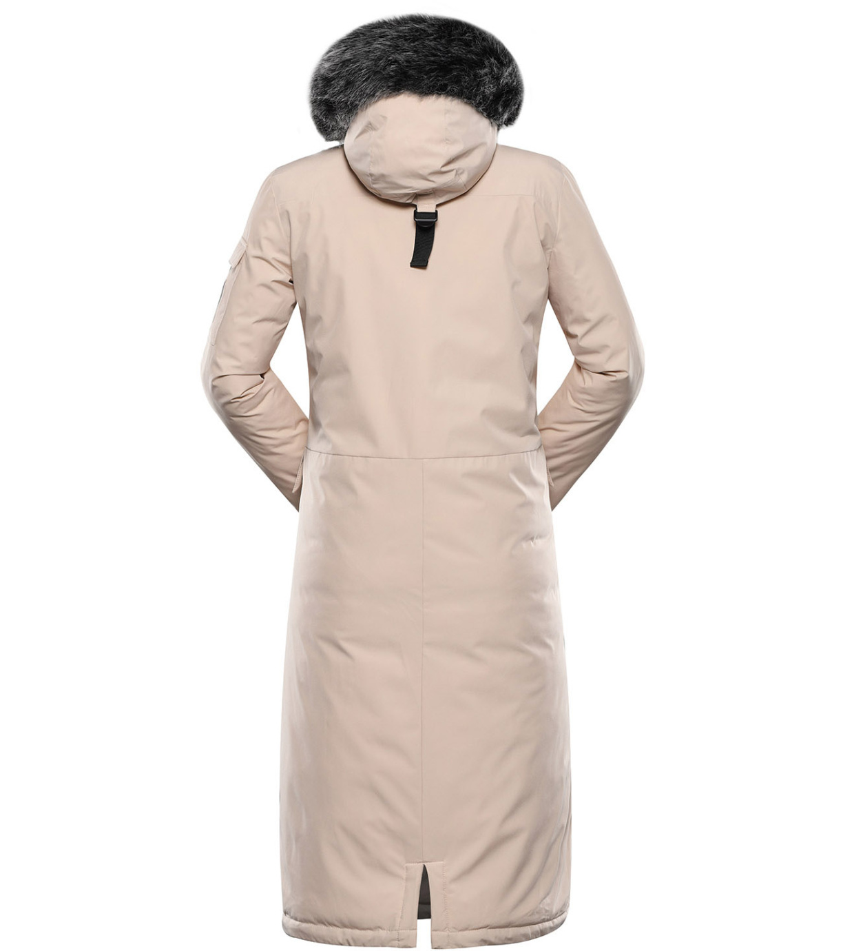 Nepremokavá, vetruodolná a zároveň pružná tkanina je doplnená silnou hrejivou výplňou a prešívanou podšívkou, ktoré zaručujú teplo aj pri veľmi nízkych teplotách. Polopriliehavý strih lichotí ženskej postave a pritom neobmedzuje v pohybe. Neodopínateľná kapucňa s možnosťou odobratia kožušinového lemu dodáva kabátu štýl av kombinácii s vnútorným golierom z mäkkého materiálu účinne chráni pred zimou.