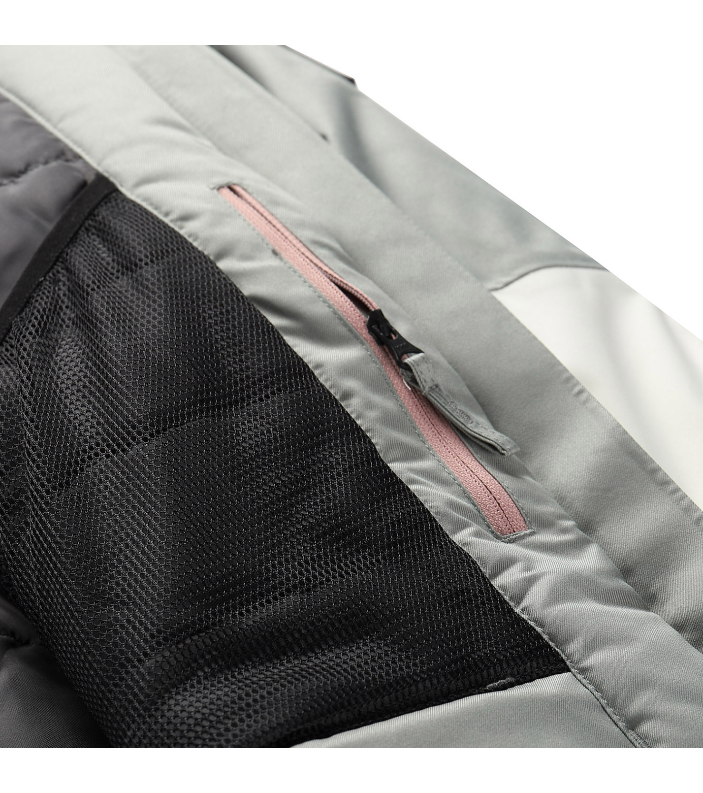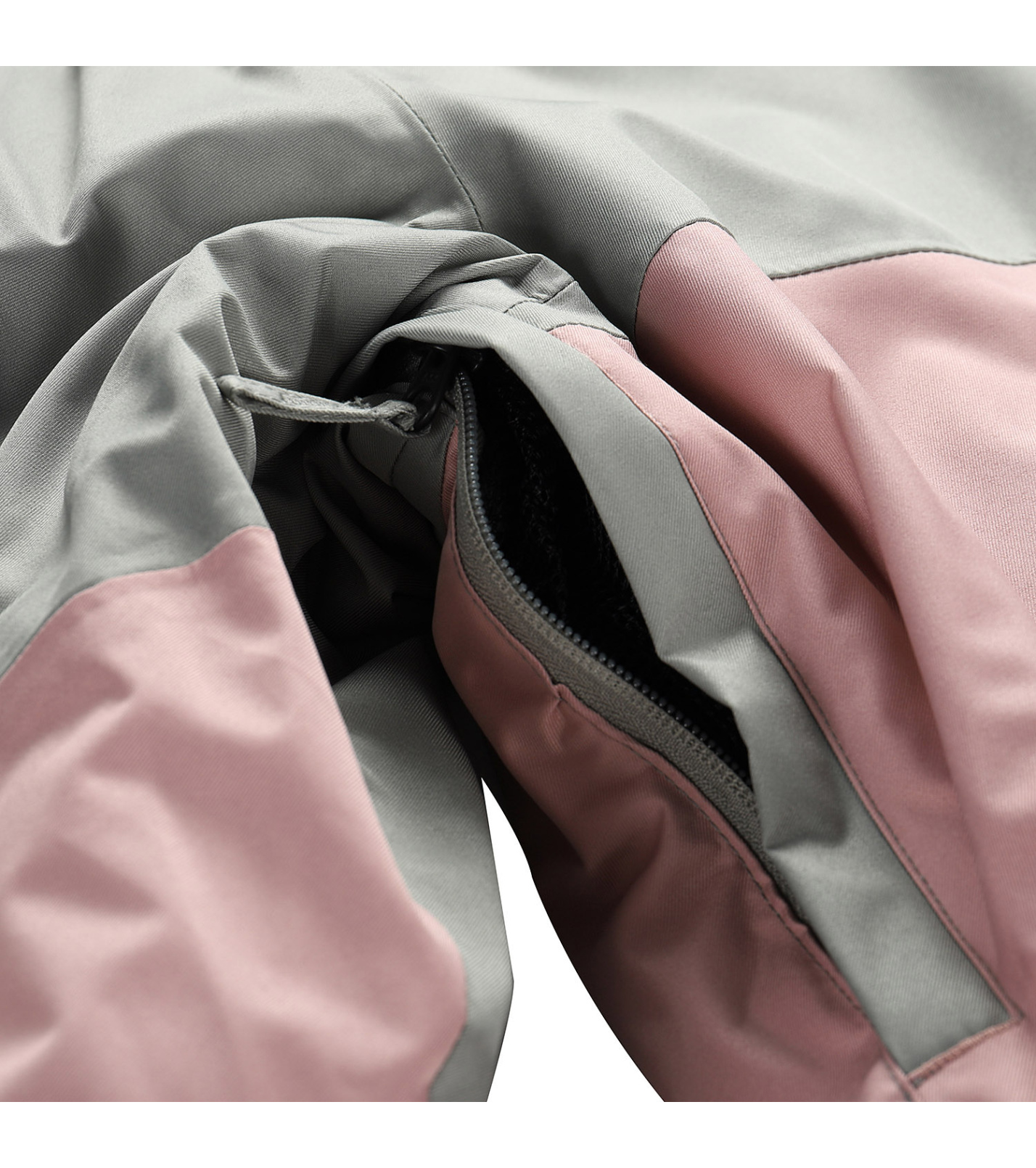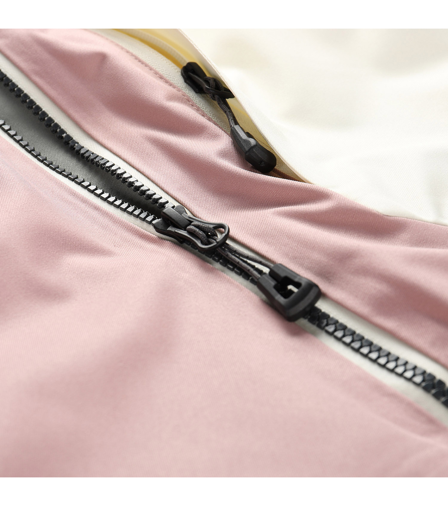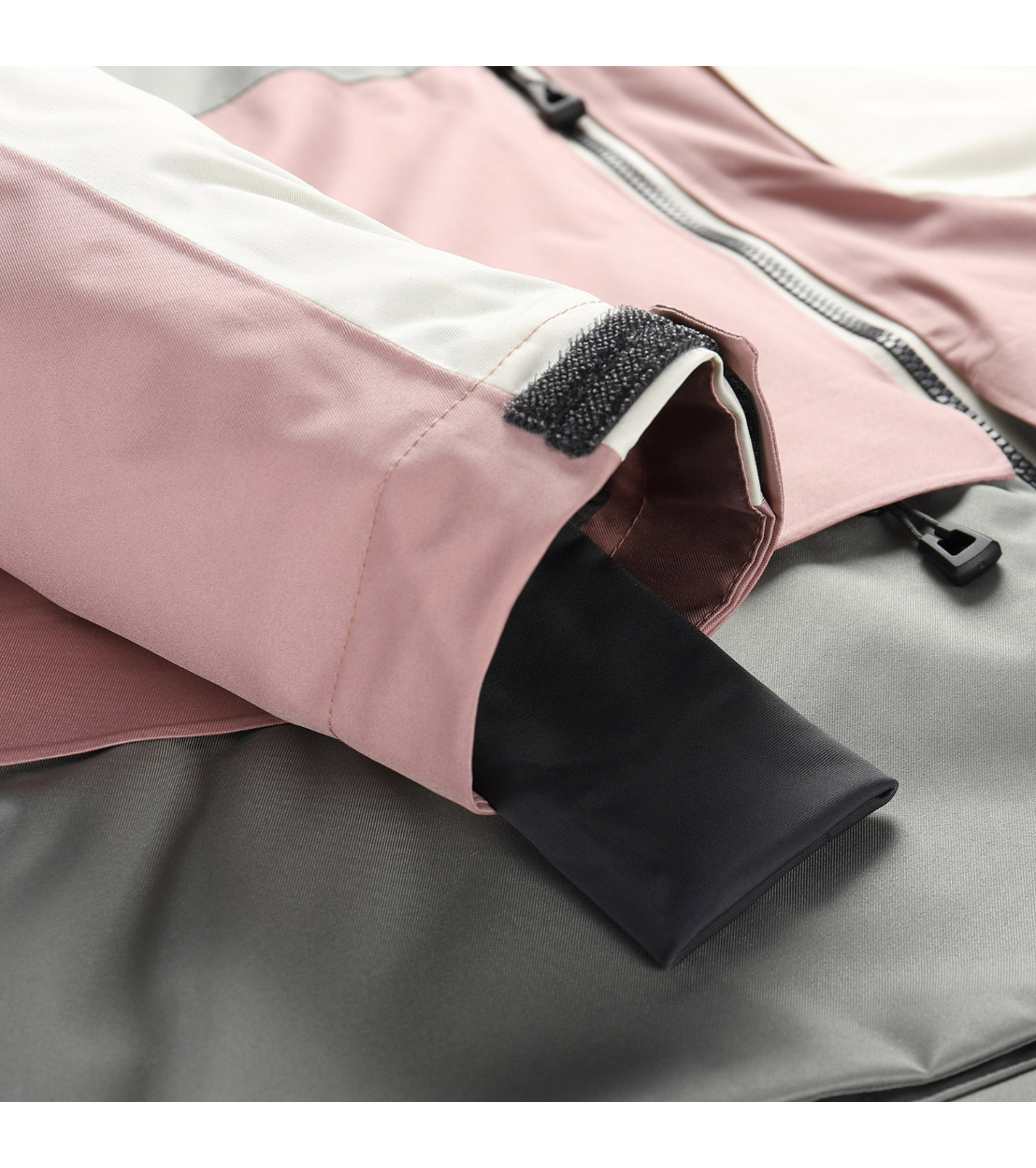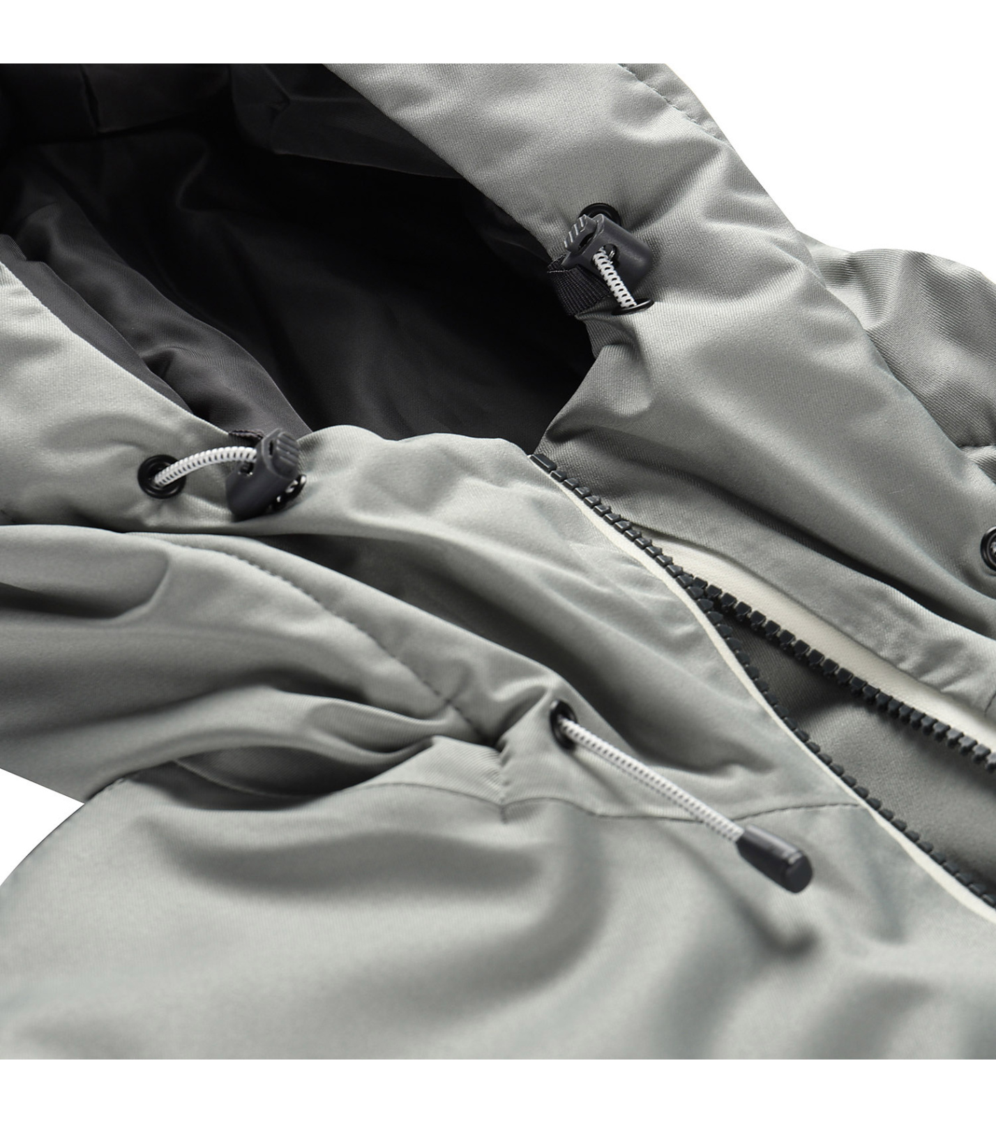 Bunda má voľný strih, ktorý poskytuje dostatok pohybu a pohodlia, a je vybavená praktickými detailmi, ako je odvetrávanie v podpazuší s vodeodolnými zipsami pre reguláciu teploty. Podšívka je prešívaná, čo prispieva k lepšej tepelnej izolácii. Rukávy sú vybavené manžetami so suchým zipsom a vnútornou elastickou manžetou na palec, ktorá zaisťuje, že sneh a vietor nepreniknú dovnútra. Odopínateľný snehový pás a spodná časť bundy s reguláciou šírky pomocou sťahovacej gumičky poskytujú vynikajúcu ochranu proti snehu, zatiaľ čo predĺžený zadný diel zaisťuje extra pokrytie. Švy sú podlepené, čo zabraňuje vniknutiu vlhkosti, a dlhšie ťahačky uľahčujú manipuláciu s bundou, aj keď máte na rukách rukavice.