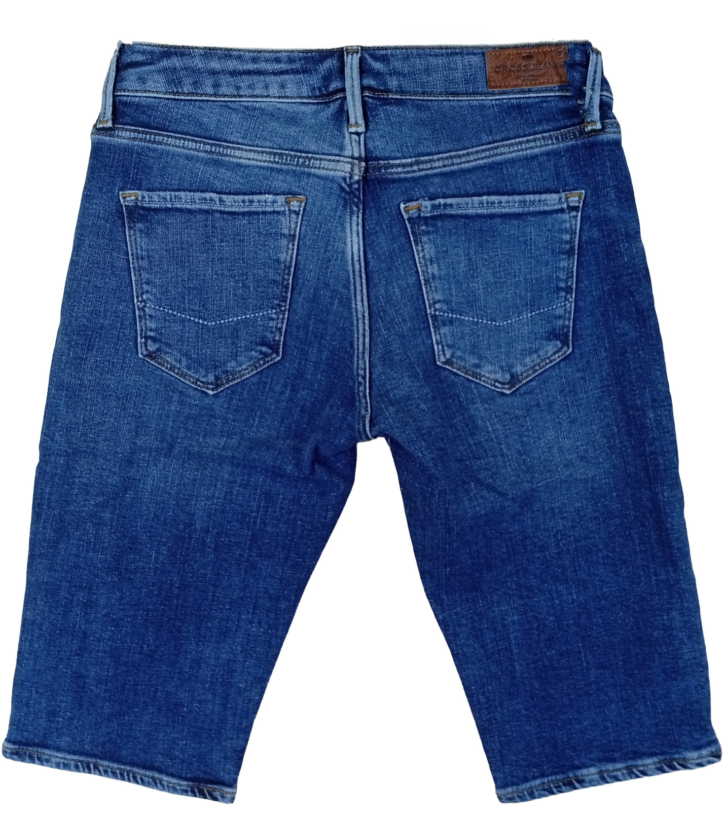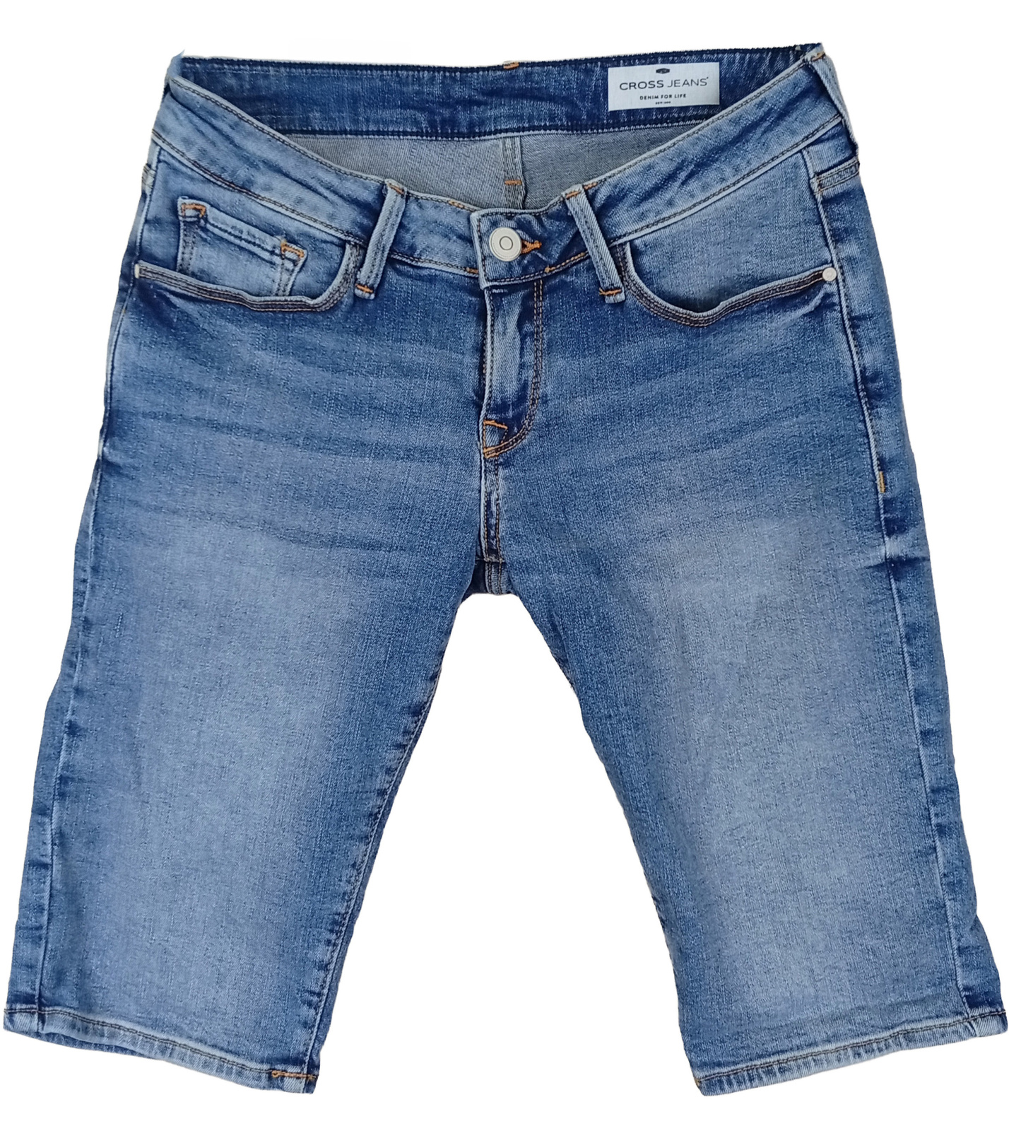 Dámske džínsové kraťasy značky Cross Jeans v klasickom modrom odtieni s ľahko opraným efektom. Pohodlný strih s dĺžkou nad kolená je ideálny na každodenné nosenie aj voľný čas. Vďaka zapínaniu na gombík a zips a tradičnému päťvreckovému štýlu pôsobia nadčasovo a ľahko sa kombinujú s tričkom, košeľou alebo letnou blúzkou. Jemne elastický denim sa postará o príjemné nosenie a dokonalé prispôsobenie postave. Tieto šortky sú skvelou voľbou pre ženy, ktoré hľadajú univerzálny kúsok do letného šatníka.
