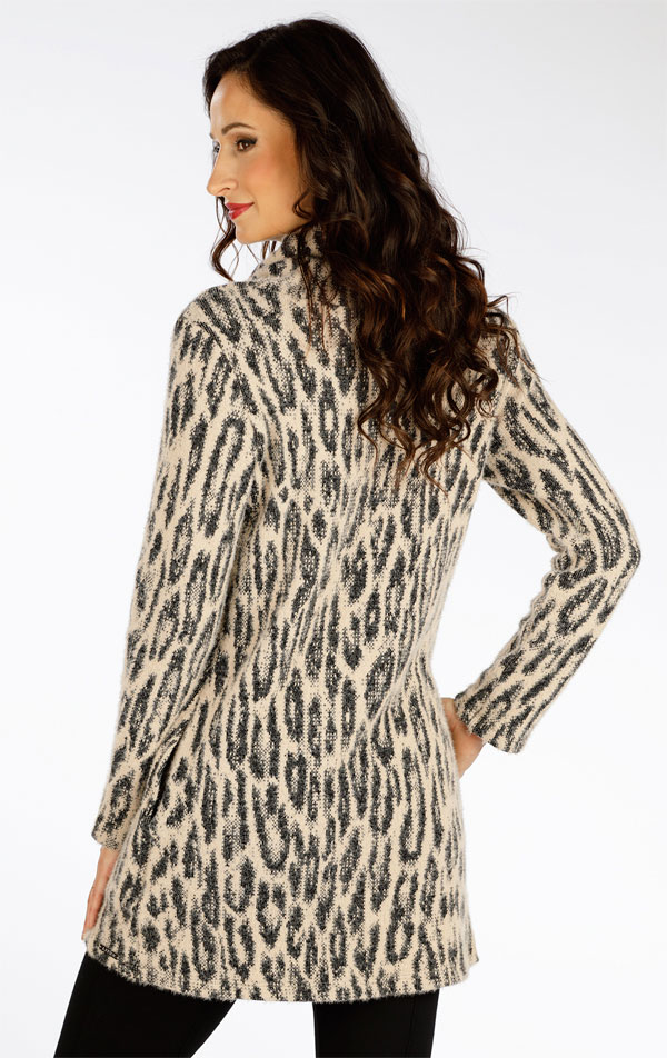 Vysoký stojak s priechodkami a šnúrkou so striebornými koncovkami. Praktické bočné vrecká. Silnejšia pletenina so zvieracím vzorom je pružná a príjemná na tele. Originálna tunika, ktorá Vás zahreje a je praktická na údržbu.