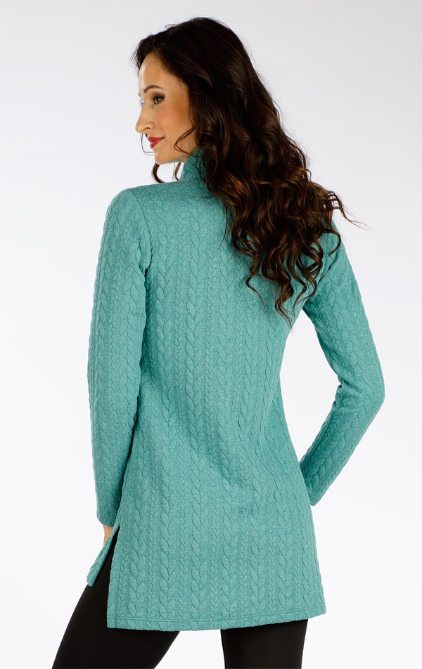 Vysoký spadnutý rolák. Dlhší zadný diel. Na bokoch rázporky. Úplet s plastickým vzorom obľúbených vrkôčikov je pružný, silnejší materiál, ktorý Vás zahreje a je praktický na údržbu.