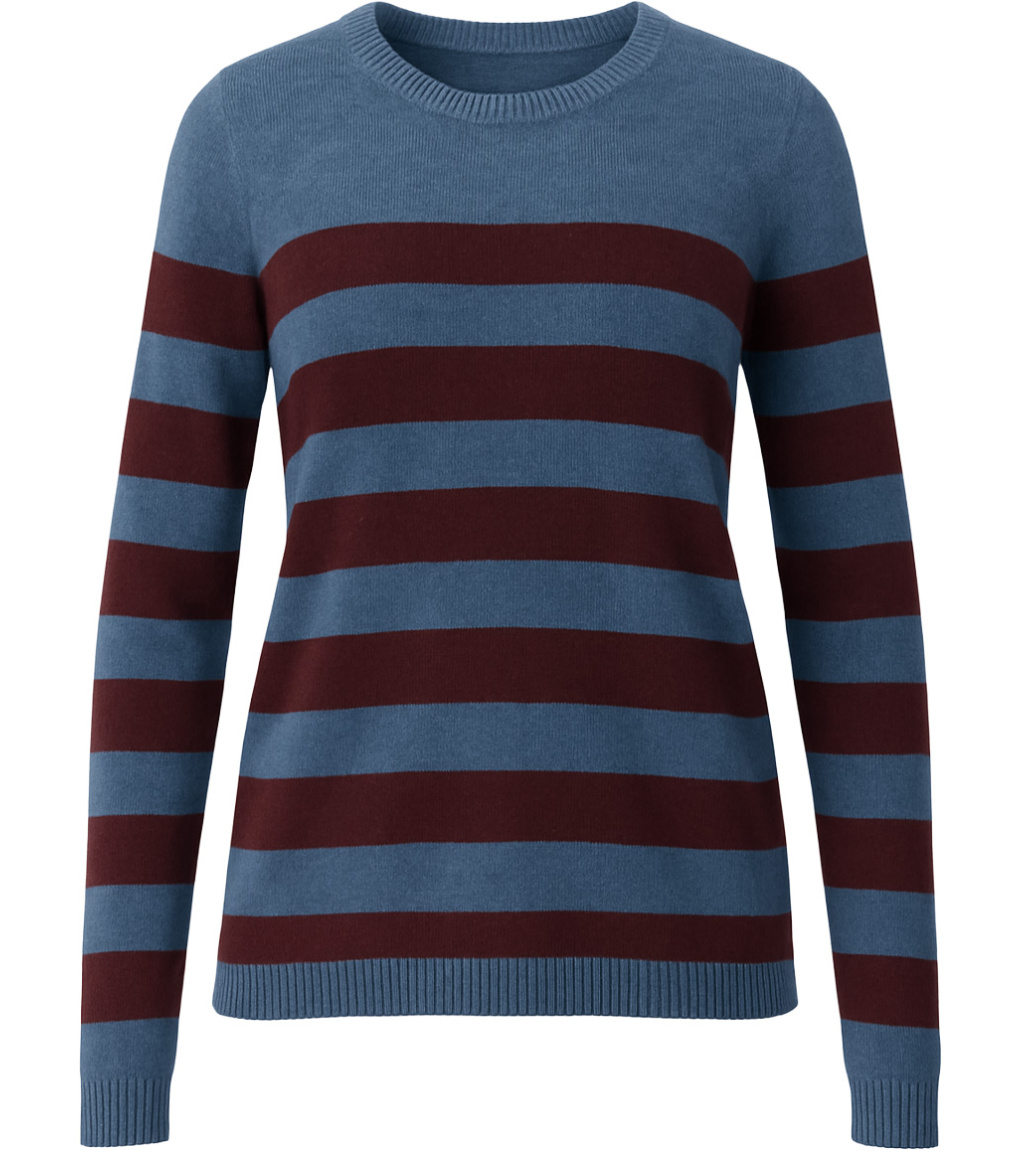 Tenký pruhovaný sveter s okrúhlym výstrihom v kombinácii modrej a vínovej farby. Vyrobený z mäkkého a príjemného materiálu, ktorý poskytuje komfort pri nosení po celý deň. Rebrované lemy na rukávoch, spodnom okraji aj výstrihu zaisťujú dokonalý tvar a pohodlné padnutie. Štýlový kúsok na každodenné nosenie, ktorý ľahko skombinujete s džínsami či sukňou.