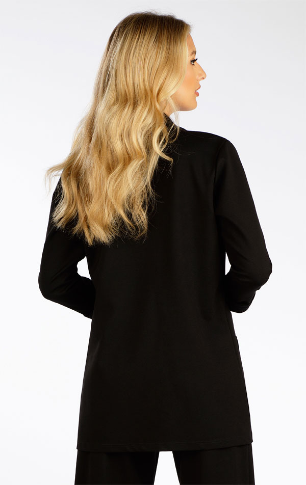 Ležérny štýl s 3/4 rukávmi a vyhrnutou manžetou. Sako má fazónový golier a praktické vrecká našité na predných dieloch. Voľnejší strih bez zapínania. Silnejší elastický úplet perfektne drží tvar a je príjemný na nosenie. Veľmi praktický kombinovateľný kúsok.