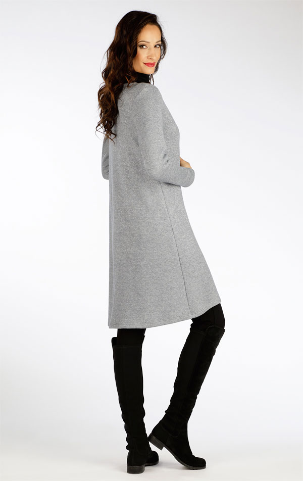 Voľný strih bez zapínania. Kvalitná pletenina so strieborným vláknom je pružná a tvarovo stála. Príjemná rubová strana na komfortné nosenie. Dĺžka kardiganu cca 100 cm.