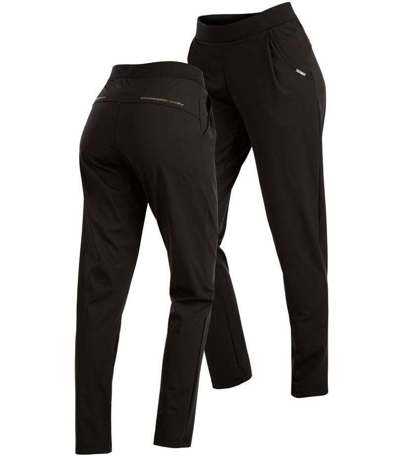 Dámske nohavice do pása. Elegantný strih s vyšším sedom a elastickým pásom. Praktické bočné vrecká. Na zadnom diele ozdobná kamienková aplikácia. Materiál je ľahko sťahujúci, pružný, nekrčí sa a rýchlo schne. Veľmi praktický kombinovateľný kúsok.