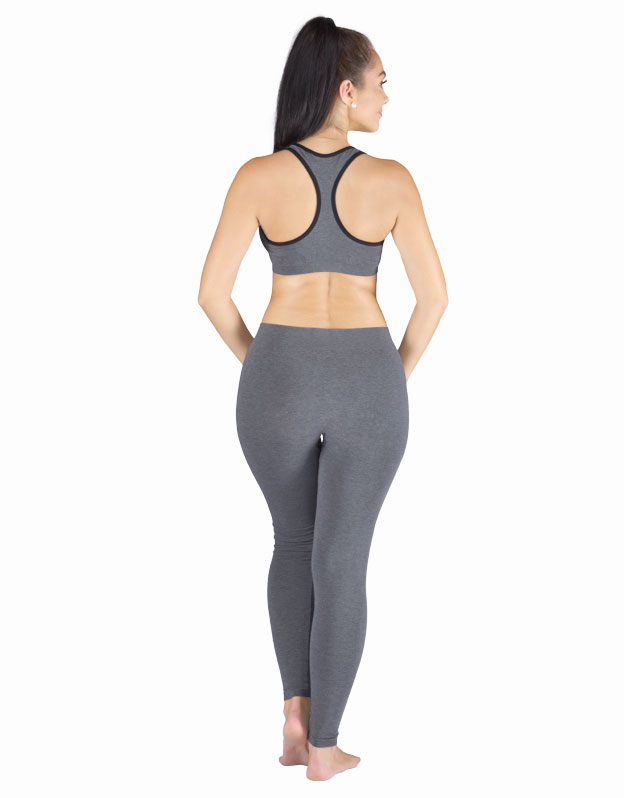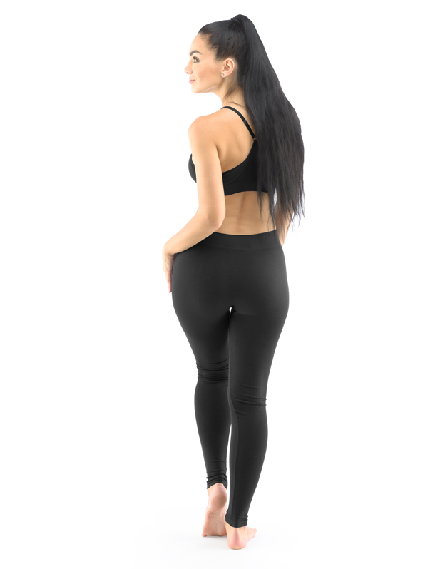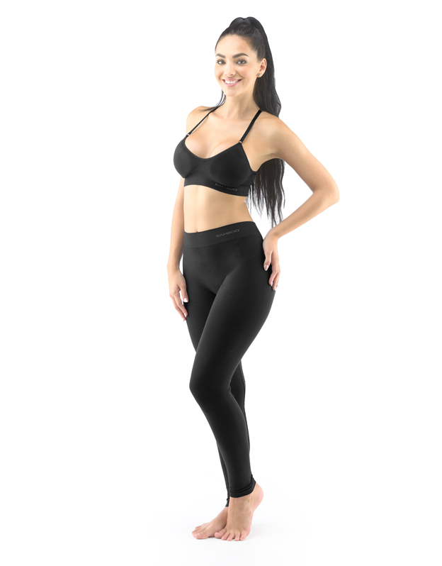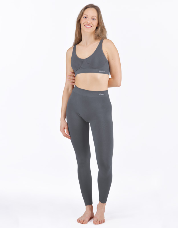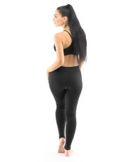 Dlhé legíny, dámska a pánska bezšvová športová bielizeň. Legíny sú jednofarebné. V záložke je vypletené logo v šedej farbe. Svojím strihom, použitým materiálom aj čiernou farbou sú tieto legíny veľmi univerzálne. Dajú sa nosiť ako pri športe, tak v zimne namiesto pančúch, ako aj v lete k dlhším tričkám ako moderná alternatíva legín.