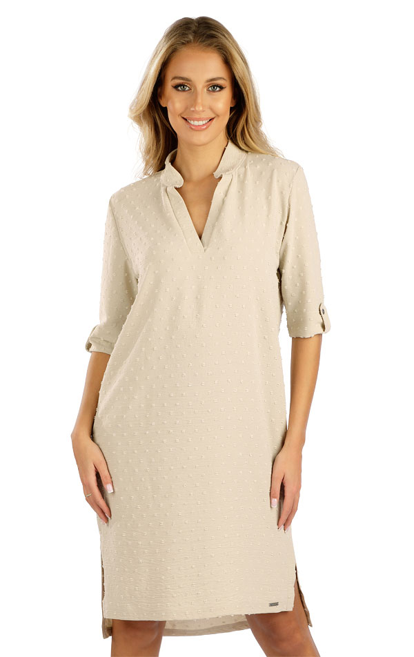 Elegantní dámské šaty se stojáčkem a ležérním výstřihem. Vypracovaný detail na rukávech. Delší zadní díl s rozparky na bocích. Vytkávaný lehký materiál zaručuje originalitu a maximální komfort při nošení. Velmi nápaditý kousek, který stylově osvěží Váš letní šatník. Délka šatů cca 95cm.