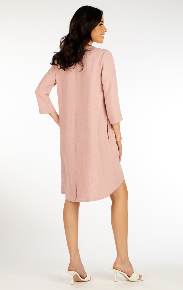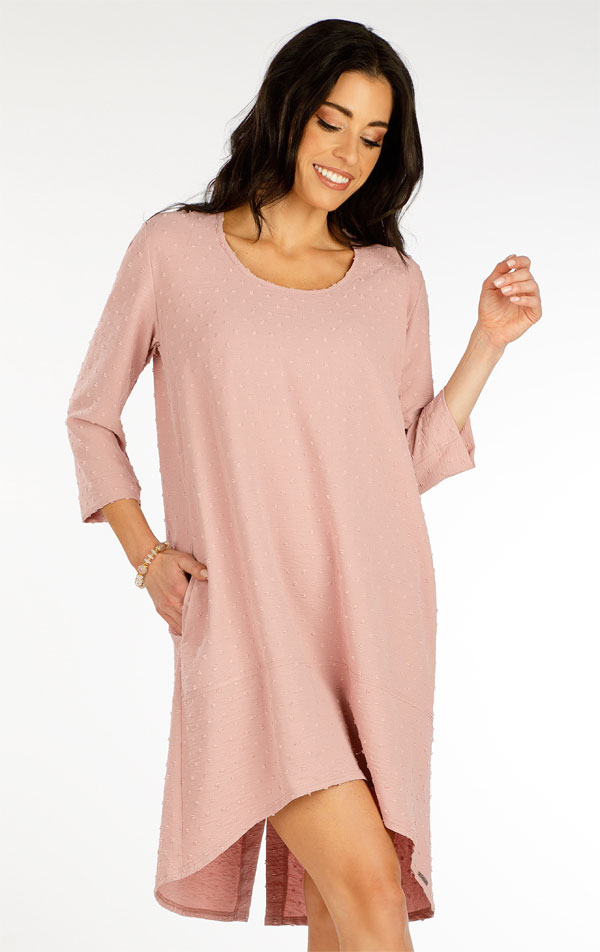 Dámske šaty s 3/4 rukávom. Šaty voľného strihu s okrúhlym výstrihom a bočnými vreckami. Tvarovaná dĺžka šiat s rázporkom na zadnom diele. Vytkávaný ľahký materiál zaručuje originalitu a maximálny komfort pri nosení. Iste oceníte nekrčivosť a jednoduchú údržbu. Veľmi nápaditý kúsok, ktorý štýlovo osvieži Váš letný šatník. Dĺžka šiat cca 98cm.