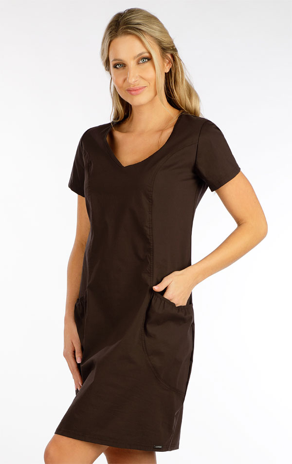 Dámske šaty s krátkym rukávom. Efektné členenie na prednom diele s riasenými vreckami.