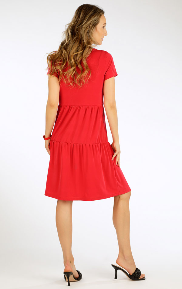 Dámske šaty s výstrihom do V, bočnými vreckami a jemnými volánmi, ktoré dodávajú modelu ženský vzhľad. Rozširujúci sa strih pôsobí ľahko a pohodlne pri nosení. Vhodné na každodenné nosenie aj letné príležitosti. Ľahká a pružná zmes polyesteru a elastanu ponúka komfort, ľahkú údržbu a nízku krčivosť. Dĺžka: cca 92 cm.