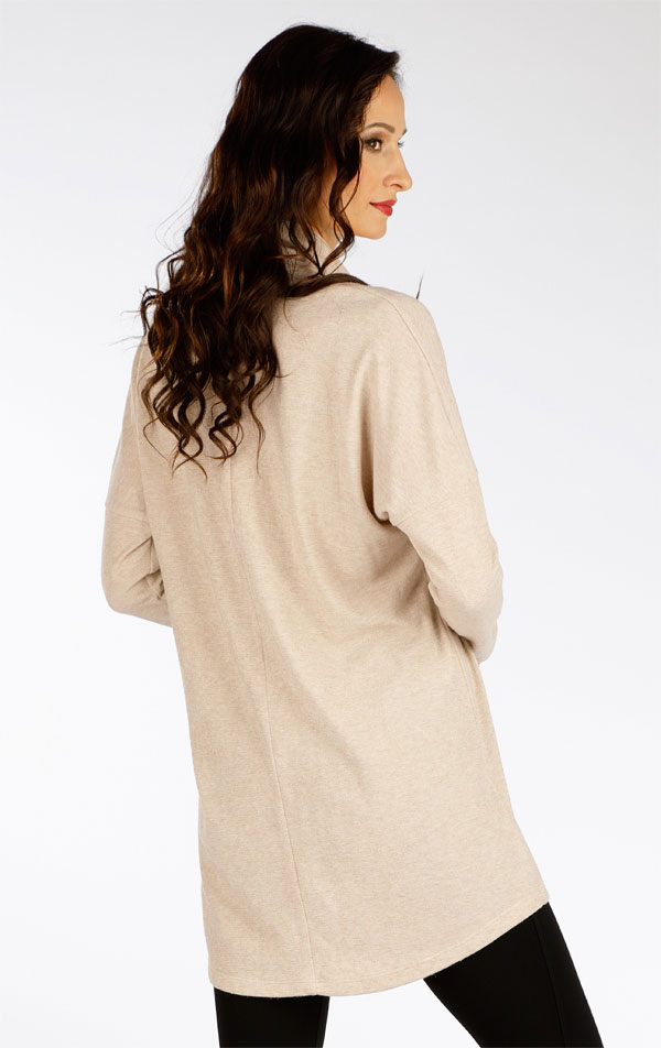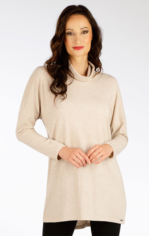 Voľný strih so spadnutým rolákom, bez vreciek a dlhším zadným dielom. Pružná a jemná pletenina vo farbe béžového melé s efektnou trblietavou nitkou. Materiál s prímesou viskózy a elastanu je veľmi príjemný na tele, splýva a nekrčí sa. Dĺžka tuniky cca 85 cm.