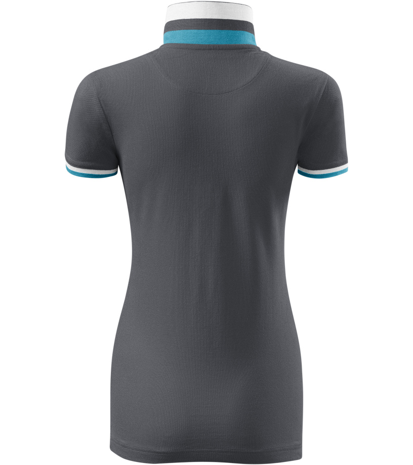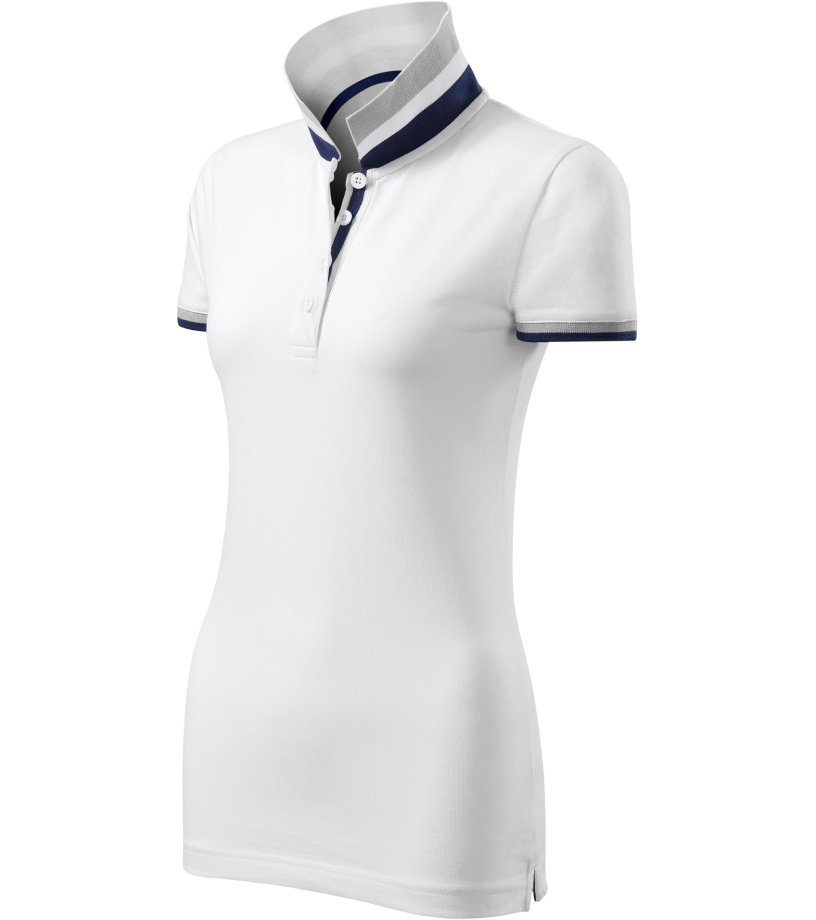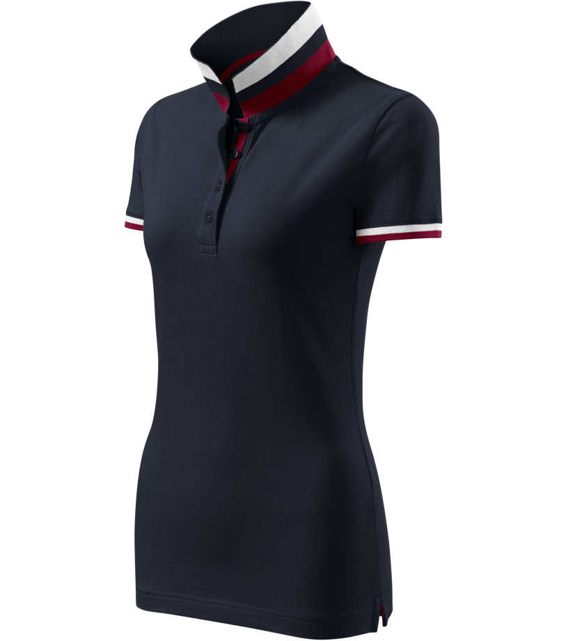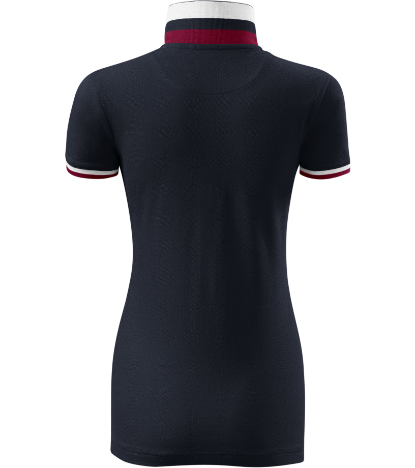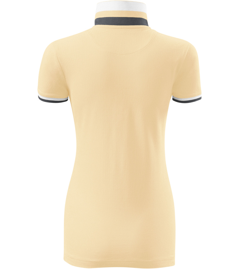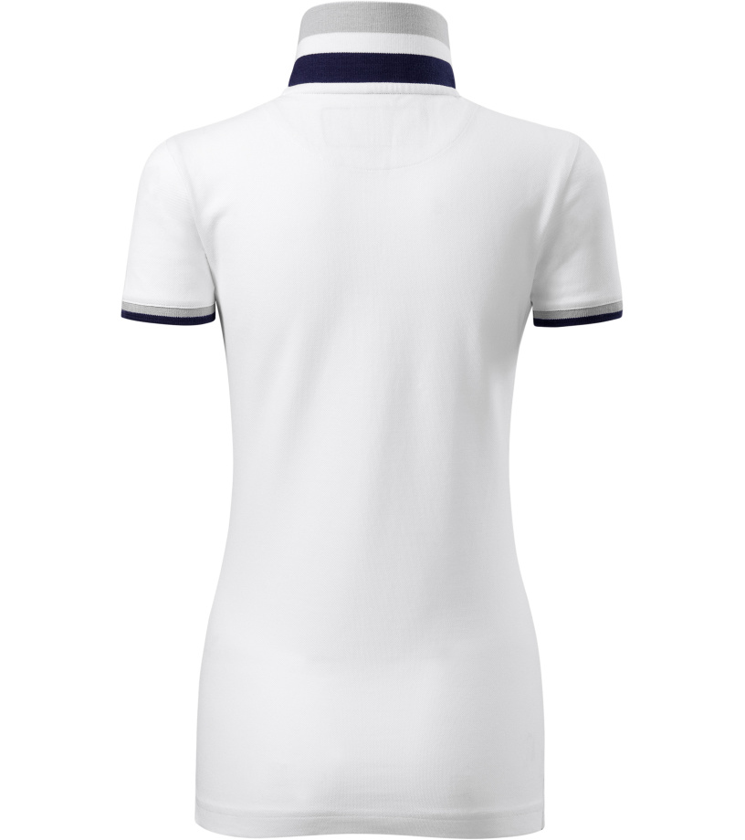 Dámske polo tričko mierne priliehavého strihu s bočnými švami vhodnými na vyšívanie a potlač má golier a lemy rukávov z rebrového úpletu 1:1, spodnú časť goliera a lemy rukávov s kontrastnými prúžkami, úzky lem so 4 gombíkmi vo farbe materiálu, rozparky v bočných švoch a spodnom leme s kontrastnou páskou, vnútorný výstrih zapečatený kontrastnou páskou a spevnenie ramenných švov páskou.