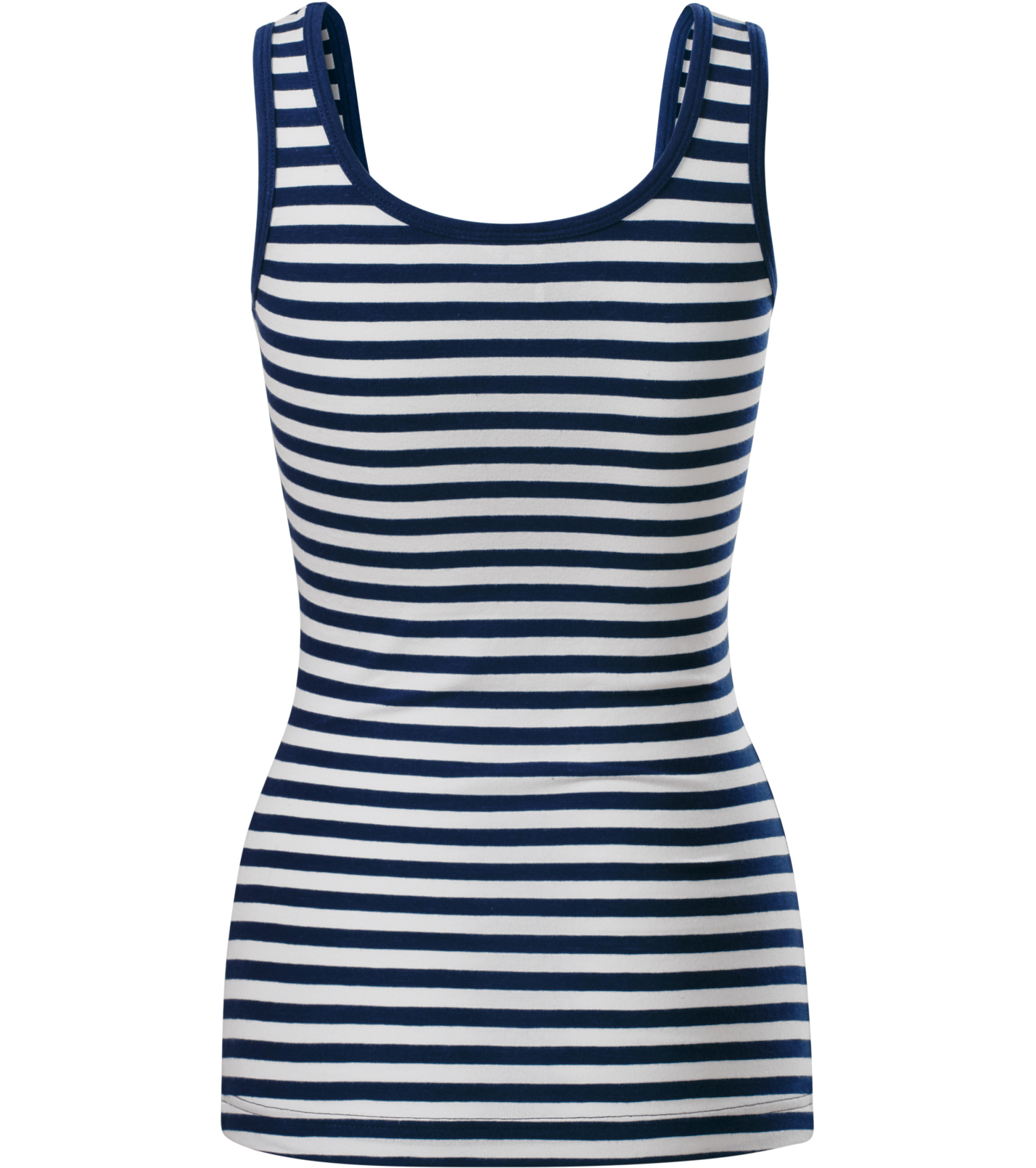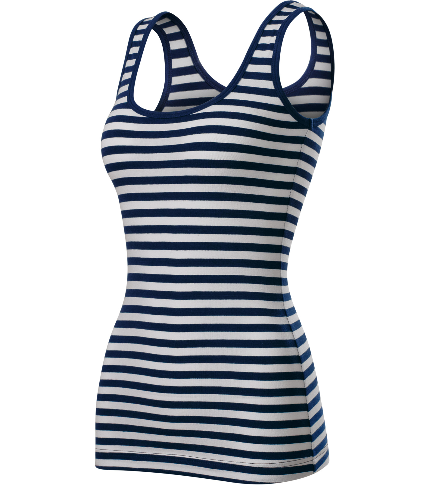 Dámske tielko s pruhmi v bielej a tmavomodrej farbe. Tielko je vyrobené z elastického materiálu, ktorý udržiava tvarovú stálosť. Má priliehavý strih s bočnými švami a hlbší okrúhly výstrih. Výstrih a prieramky sú podšité vrchným materiálom.