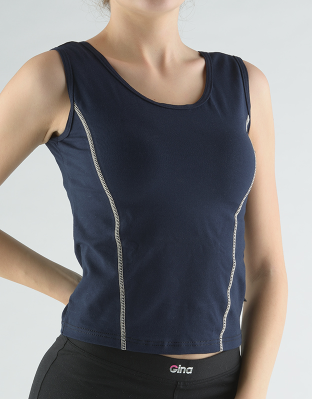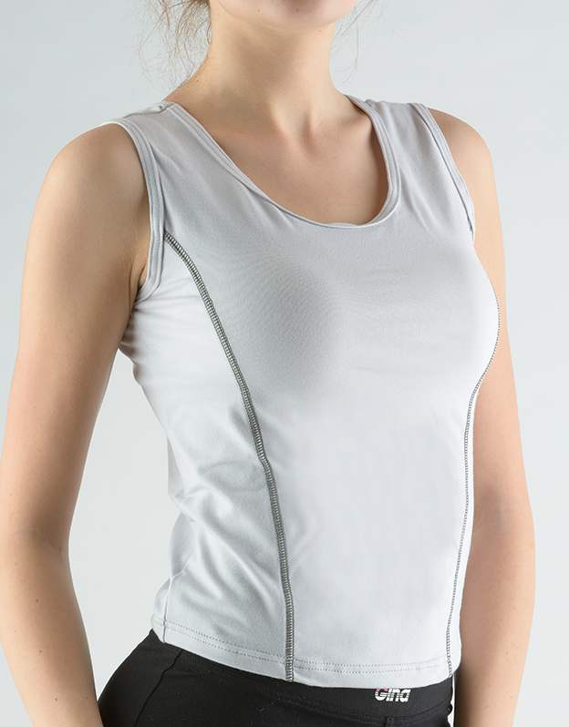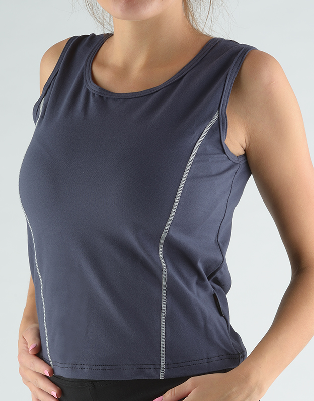 Dámske športové tielko so širšími ramienkami, dámska spodná bielizeň na mieru. Ramienka a výstrih sú ukončené lemovacími prúžkami. Tielko je jednofarebné s kontrastným prešívaním na prednej strane. Na bočnom okraji je našité logo.
