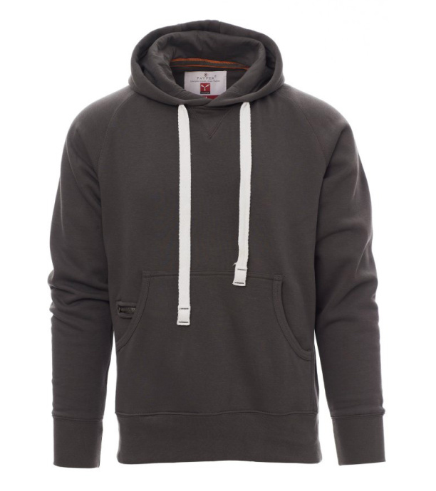 Pánska kapucňová mikina s pevným dvojitým prešitím. Kapucňa je doplnená bielou sťahovacou šnúrkou s kovovými krúžkami a decentne zladeným prešitím. Má raglánové rukávy, dekoratívne V-štep pod výstrihom a praktické klokanie vrecko s malým vreckom na zips. Rukávy aj spodný lem sú zakončené elastickým rebrovaním. Pre vyššiu odolnosť sú švy zosilnené.