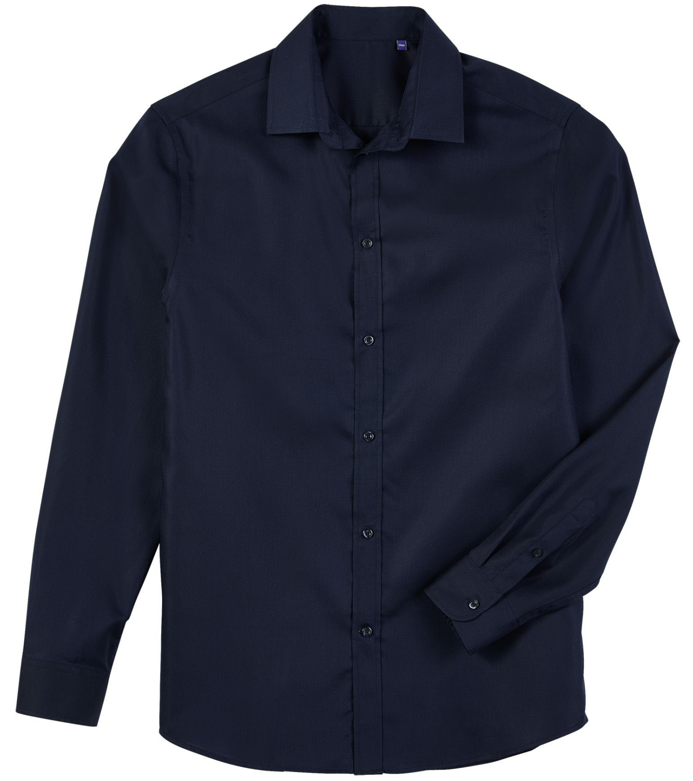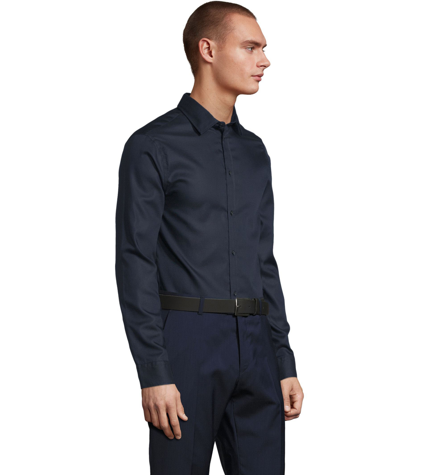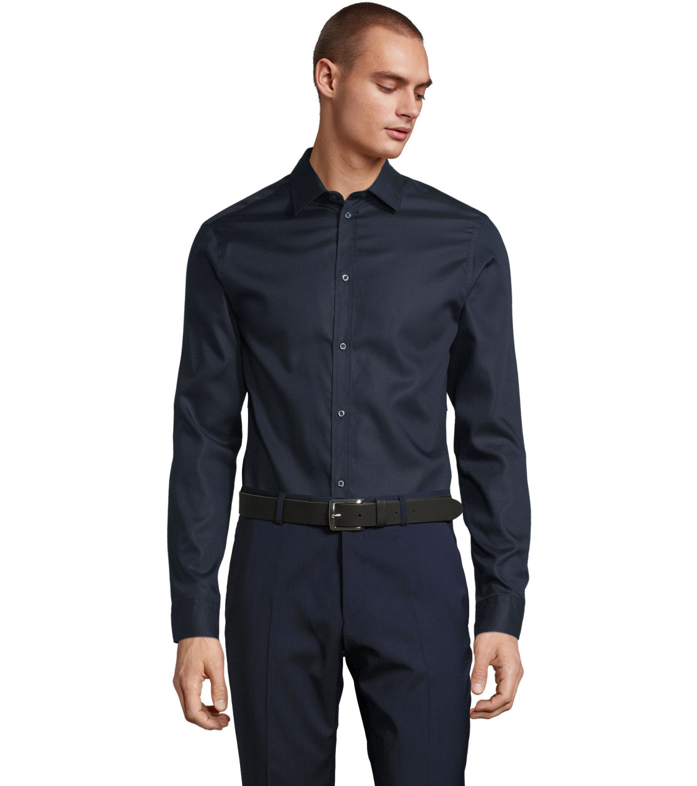 Pánska košeľa s dlhým rukávom a talianskym golierom. Zapínanie na gombíky. Rukávy sú zakončené nastaviteľnými okrúhlymi manžetami s 2 gombíkmi a viazaným rázporkom. Vyrábaná technológiou na úpravu bez žehlenia.