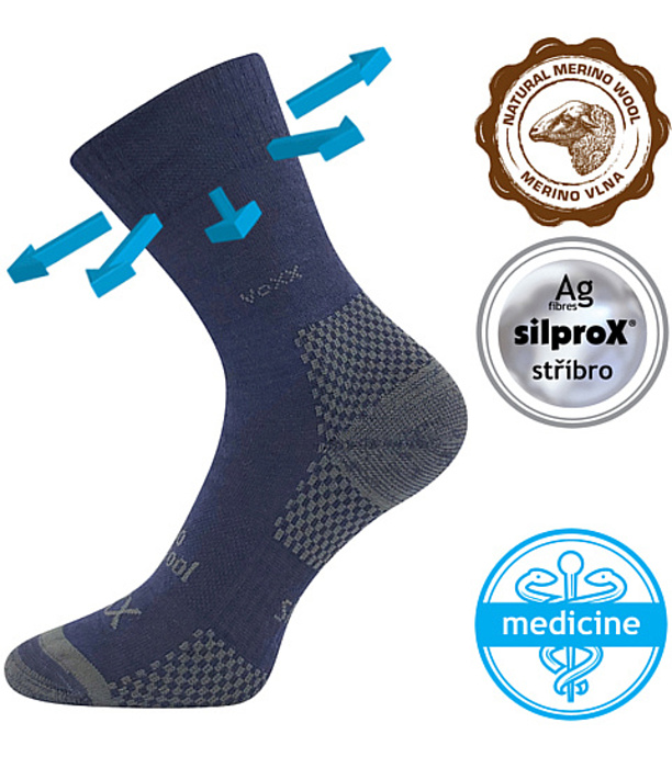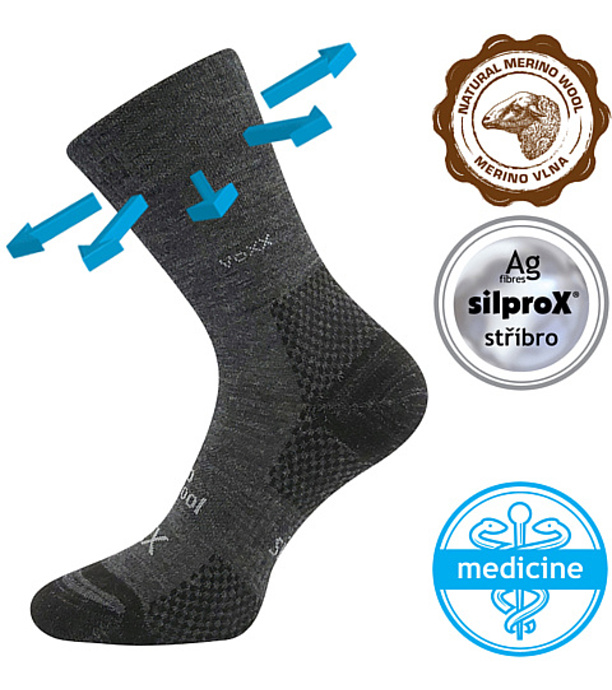 Športové ponožky z merino vlny VoXX® MENKAR môžete nosiť celý deň. Tieto unisex ponožky majú špeciálny mäkký, nekrčivý lem s polstrovanou froté stielkou a reťazovou špičkou, vďaka čomu udržia vaše nohy v kondícii pri akomkoľvek športe. O žiadnom zápachu nemôže byť ani reči vďaka antibakteriálnej ochrane iónov striebra v materiáli silproX®. V teplotnej triede C do -20 °C vám rozhodne nebude zima.