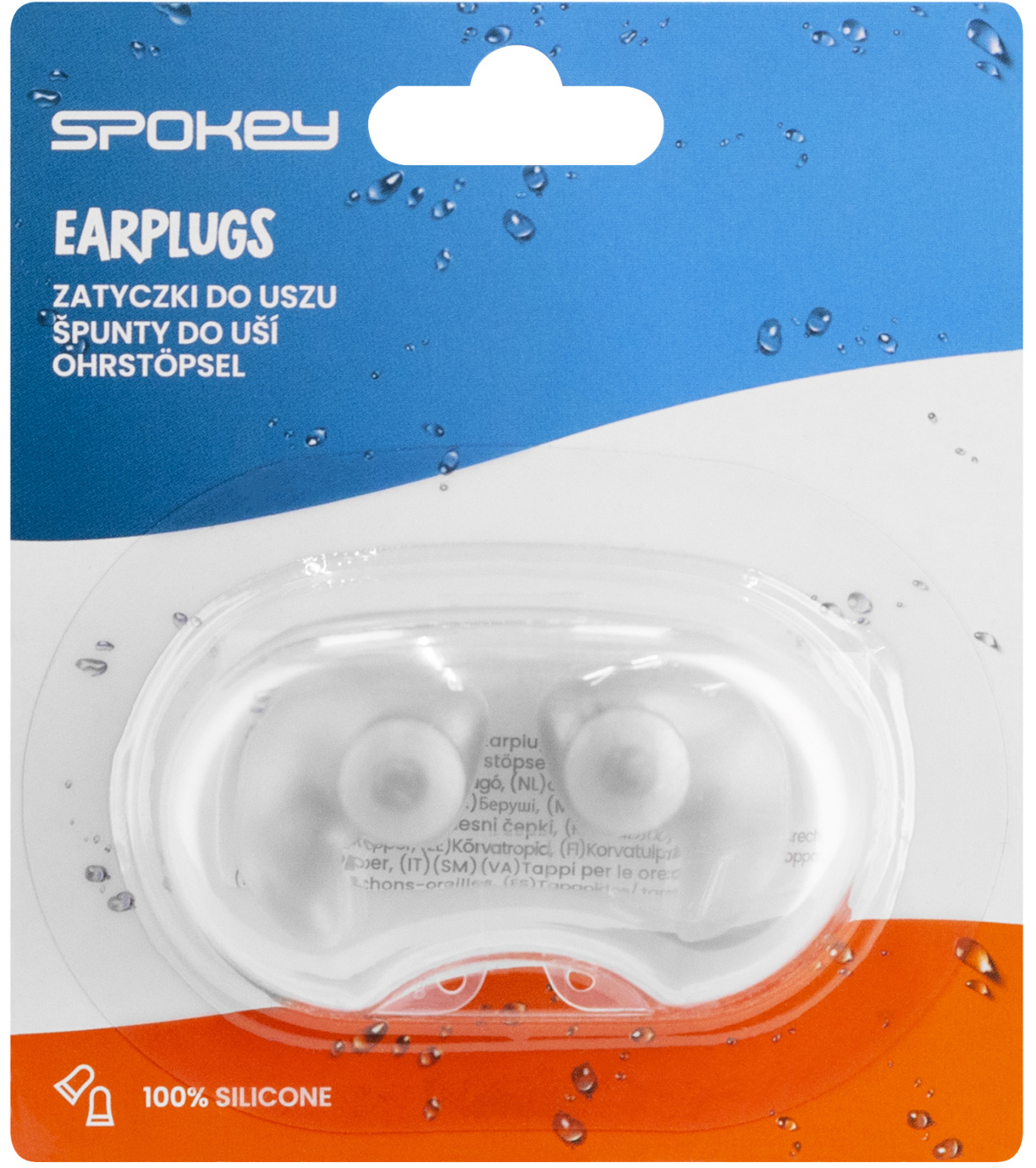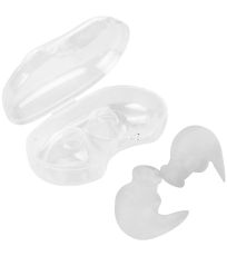Transparentní silikonové zátky do uší ochraňují vnitřní část ucha proti vniknutí vody. Kulatá plastová krabička umožňuje uložení zátek ve sterilních podmínkách.