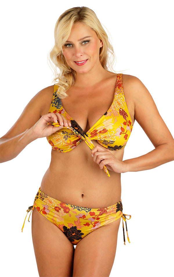 Plavková podprsenka s kosticami. Podšitá. Zapínanie na chrbte. Nastaviteľné ramienka. Obvod vystužený. Veľkosť podprsenky je možné regulovať pomocou uzla.